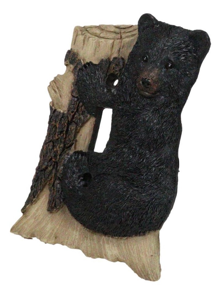 ? It is now very easy to transform your space at your home or office into a rustic Western exotic getaway with these black bear family electrical cover plates. This particular electrical plate cover features a black bear climbing up a tree trunk. With a touch of woodsy brown texture, this wall plate exudes rustic western flair.