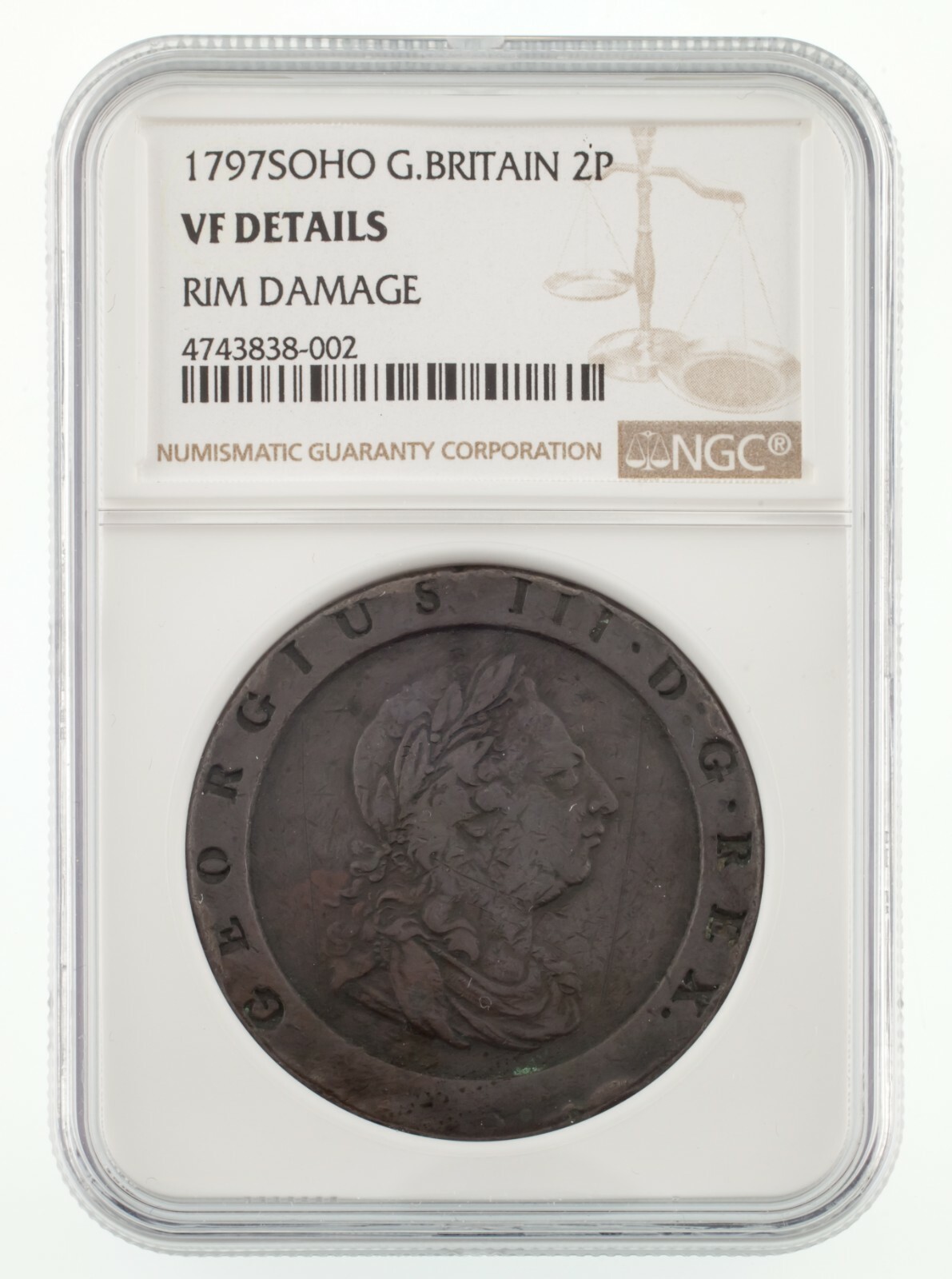 - 1797 Soho Great Britain 2 Pence Copper Coin Graded by NGC as VF Details