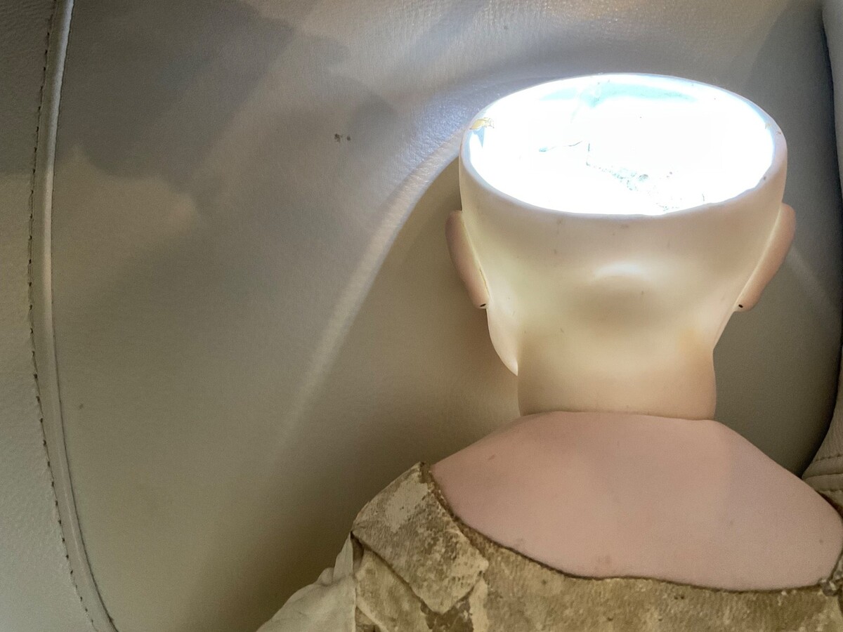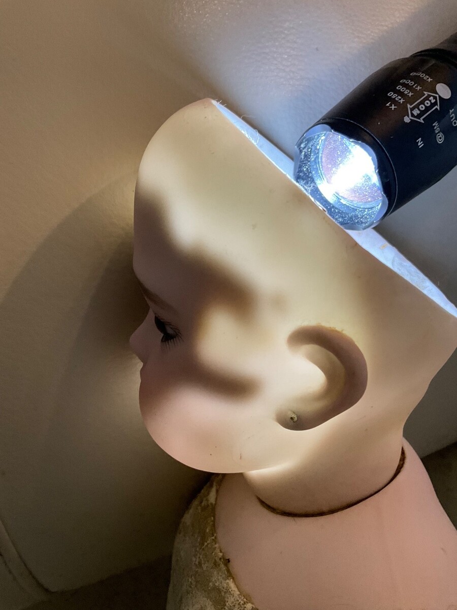 Condition: Her head is free of cracks, chips or hairlines. Her body has patches here and there. Her right arm is all taped and mostly stuffing, her left arm is wrapped in leather. Her head does not move I?m sure it did at one time. Dog not included.