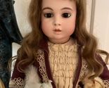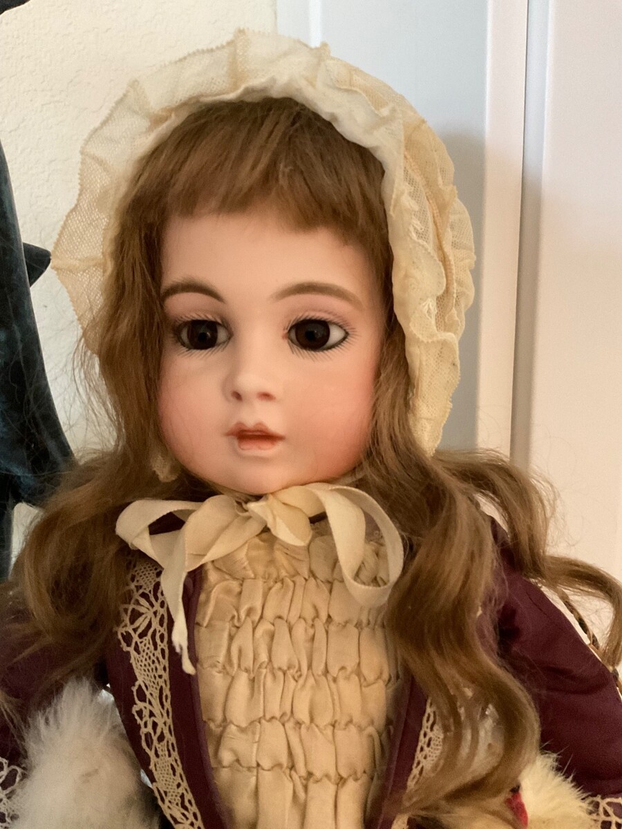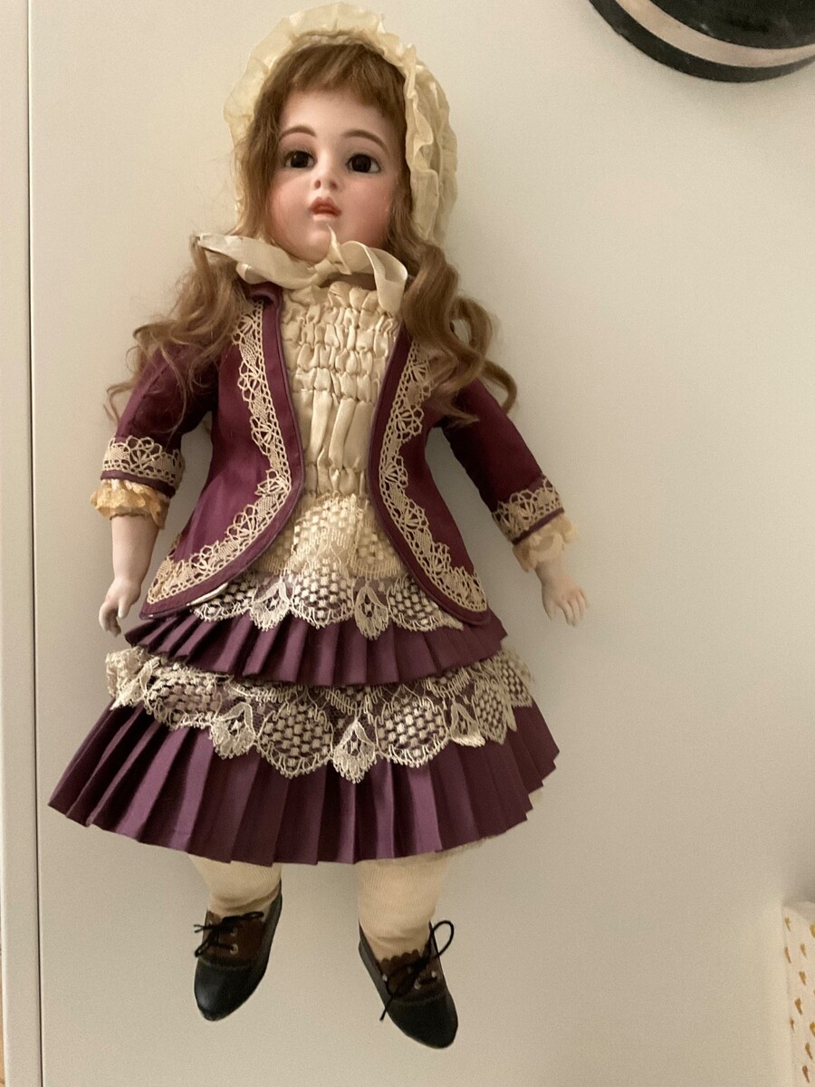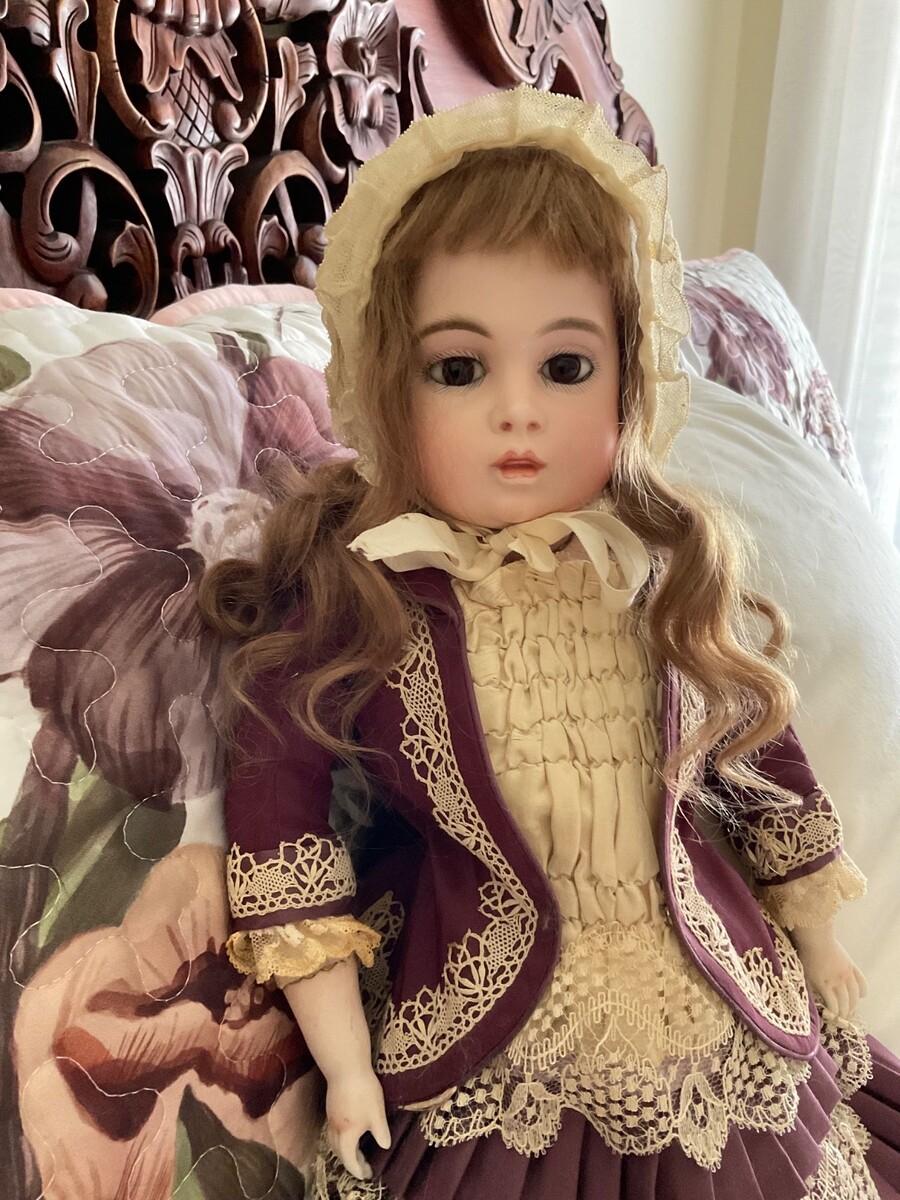 Adorable Circle Dot Bru measuring 18?. She has big brown eyes, feathered brows, slightly open mouth showing a hint of teeth. She has her original cork pate, medium brown long mohair wig. She is wearing a beautiful handmade dress with a lot of detail, bloomer type undies and a half slip, off white stockings and two/tone shoes. She is on an early goat skin body with repaired arms and one forefinger on left hand.