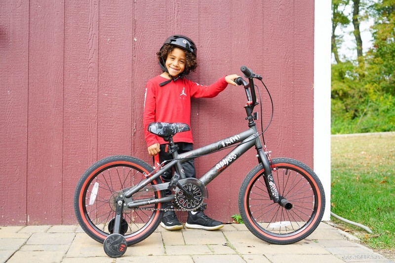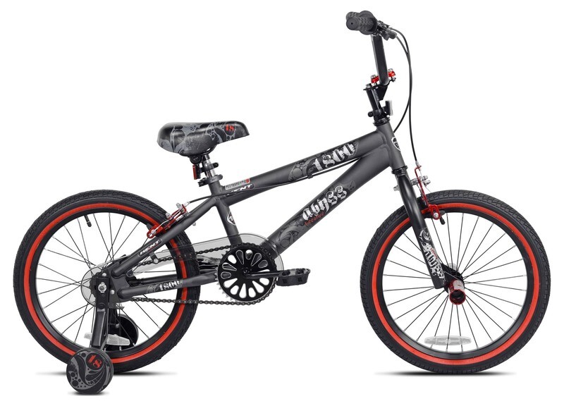 Children will enjoy the wind in their face and speeding down the sidewalk with the 18" Kent Abyss FS18 Boys' BMX Bike. It has a sleek style and is a nice in-between model for the budding freestyler. This silver bike has all the same features of the grown-up version yet is suited for a little guy that's not quite ready for full-size. It's built with a steel frame for sturdiness and comes with removable training wheels for a smooth transition. This kids' BMX bike has a saddle seat with a nice pad and hand brakes to ensure safe stops. The kickstand keeps it upright when left alone.