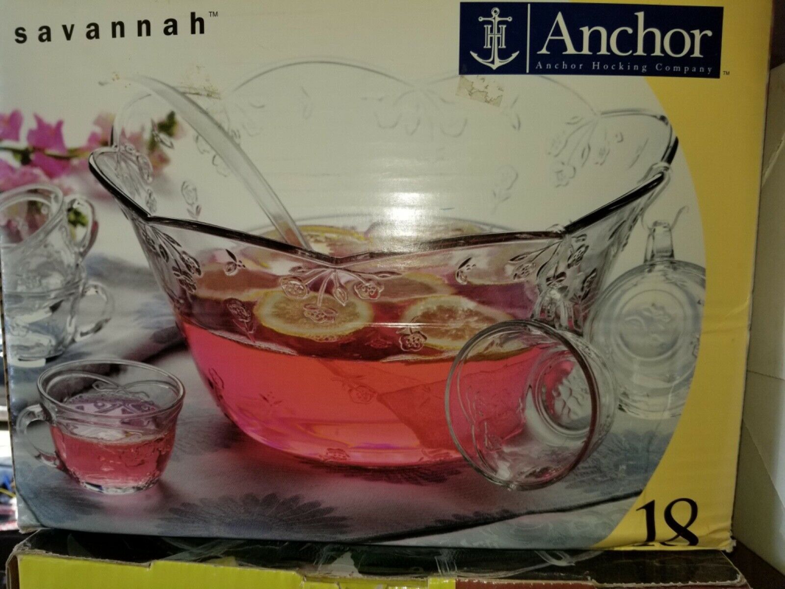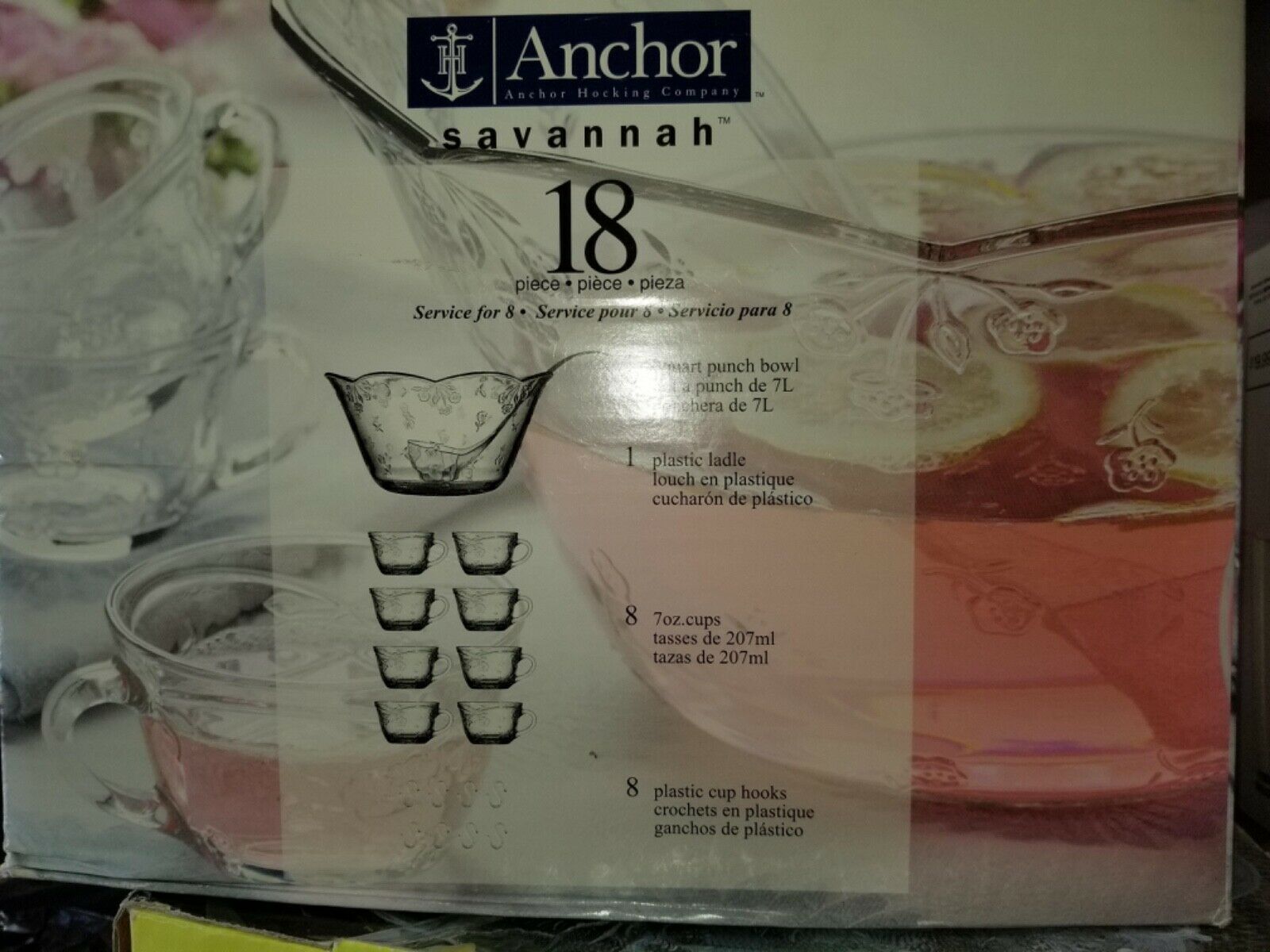 - 18 PIECE ANCHOR HOCKING PUNCH BOWL SET LADLE CUPS AND S HOOKS SERVICE FOR 8
