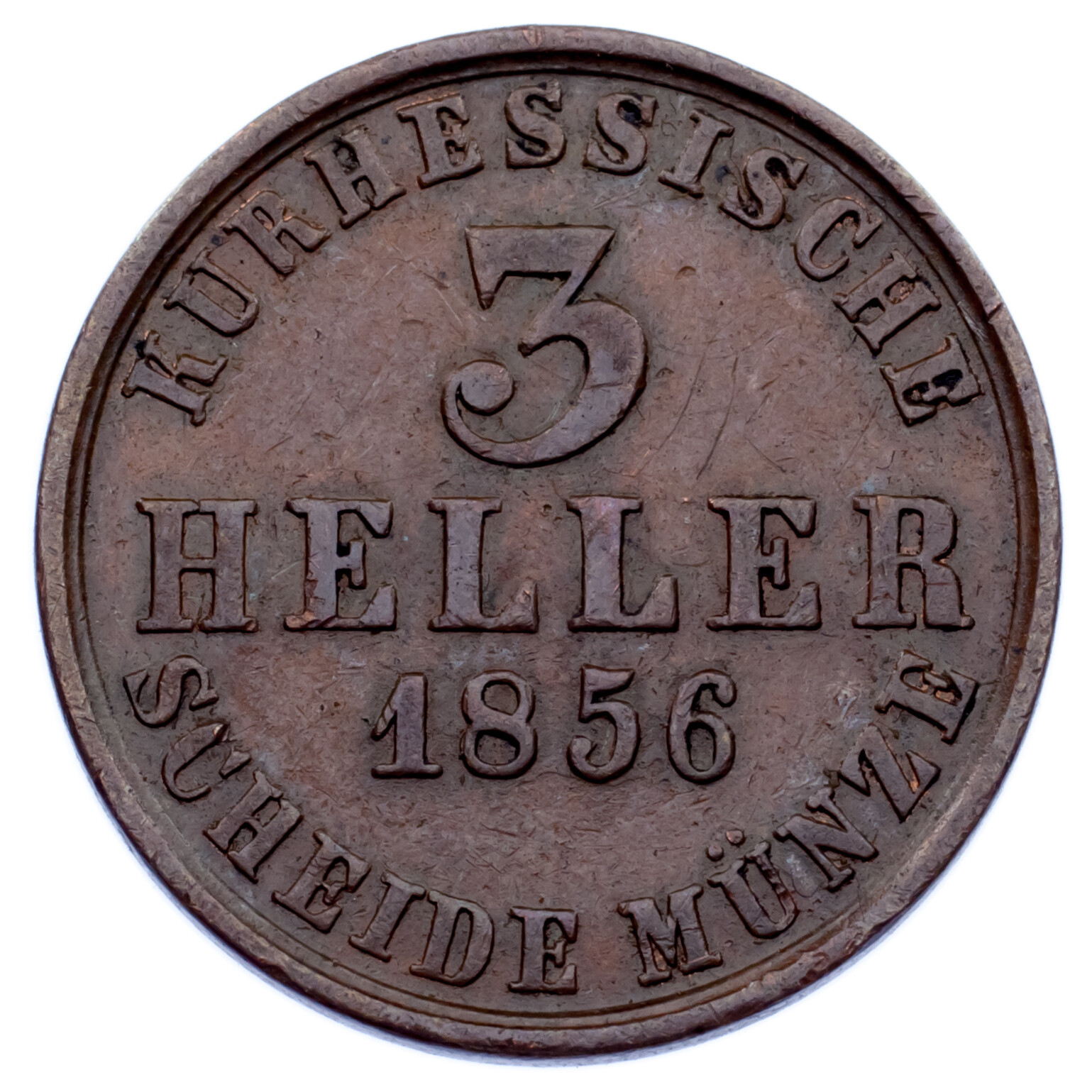 1856 German States Hesse-Cassel 3 Heller, Extra Fine (XF), KM#612, copper (unknown)