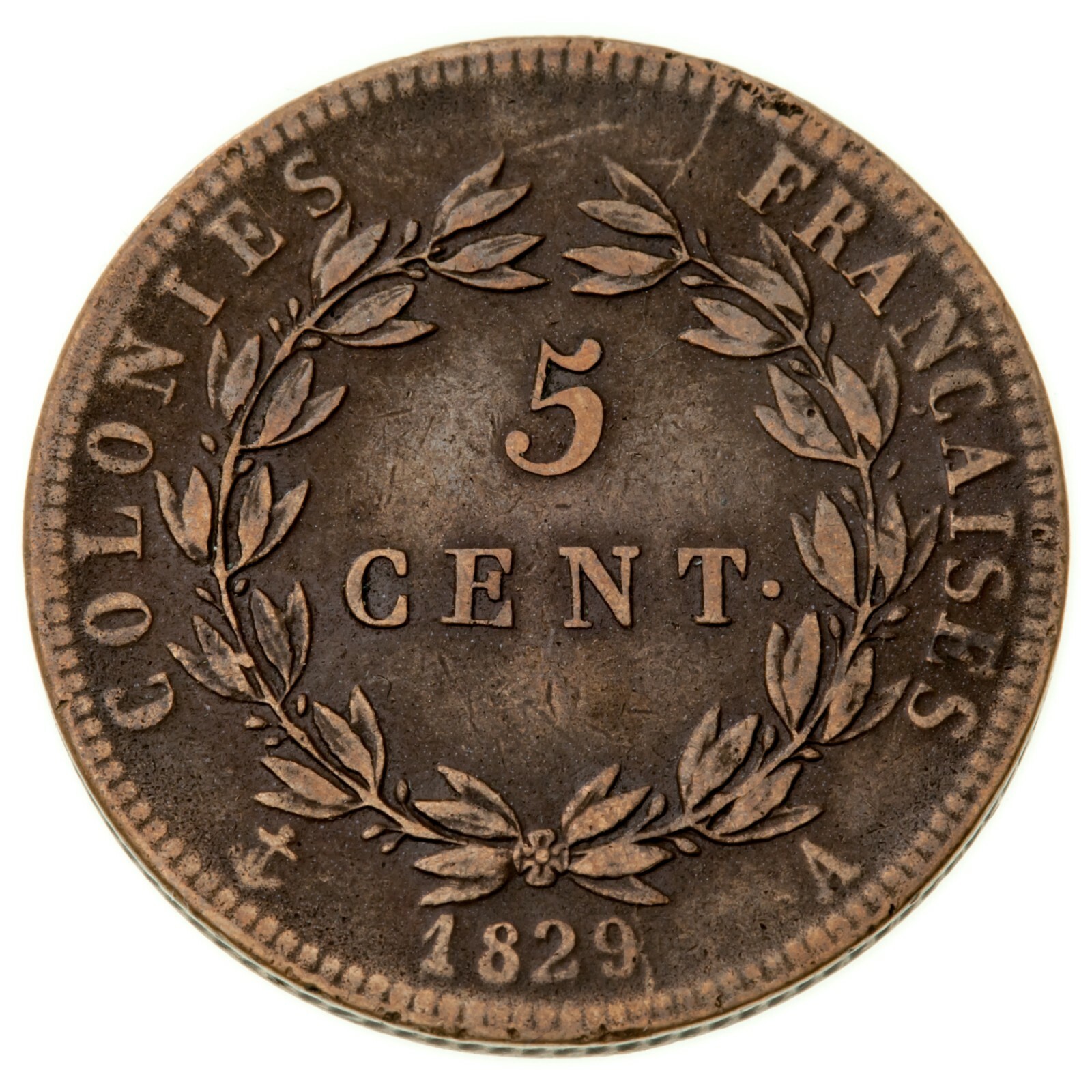 - 1829-A French Colonies 5 Centime Coin (Extra Fine, VF) Km #10.1- show origina...