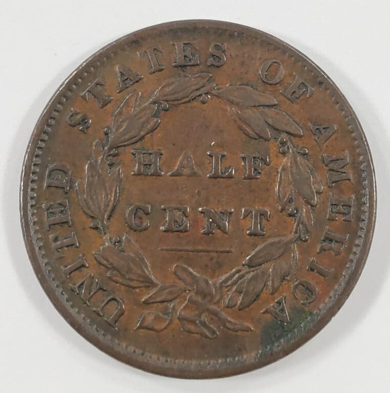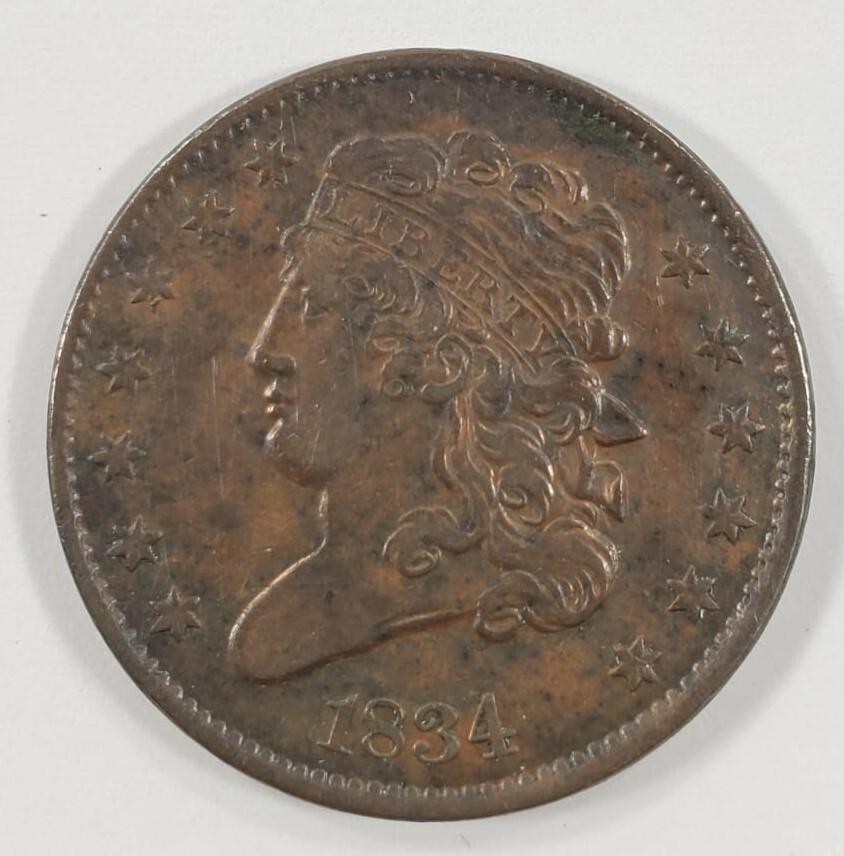 1834 Half Cent in Extra Fine XF Condition, Brown Color, Strong Detail