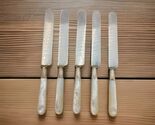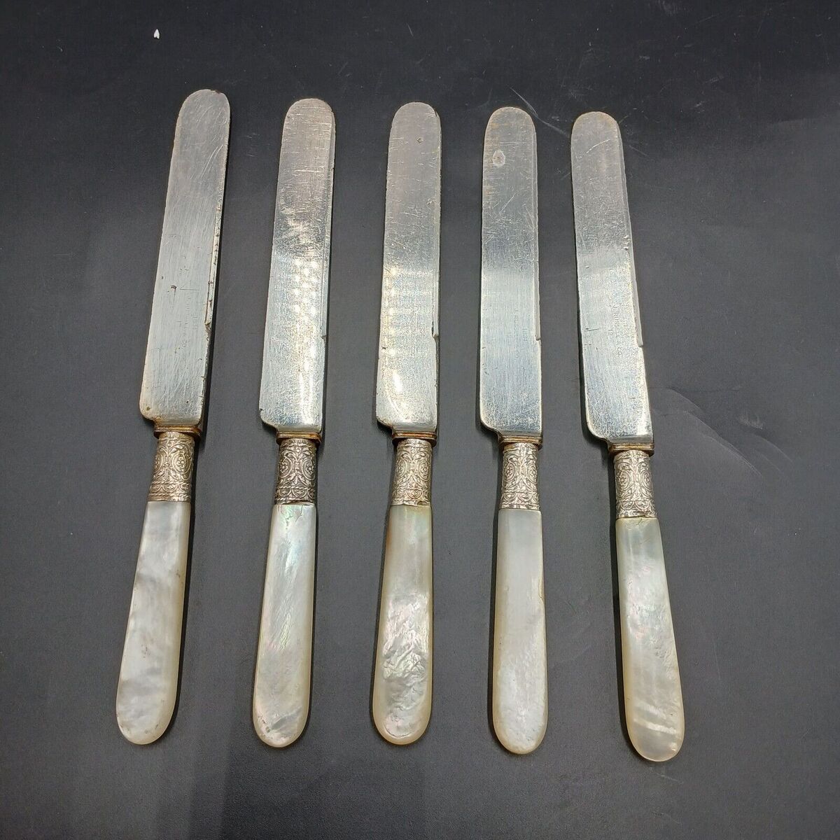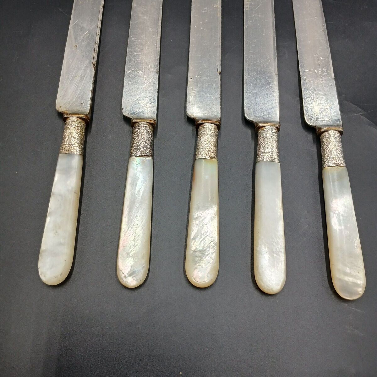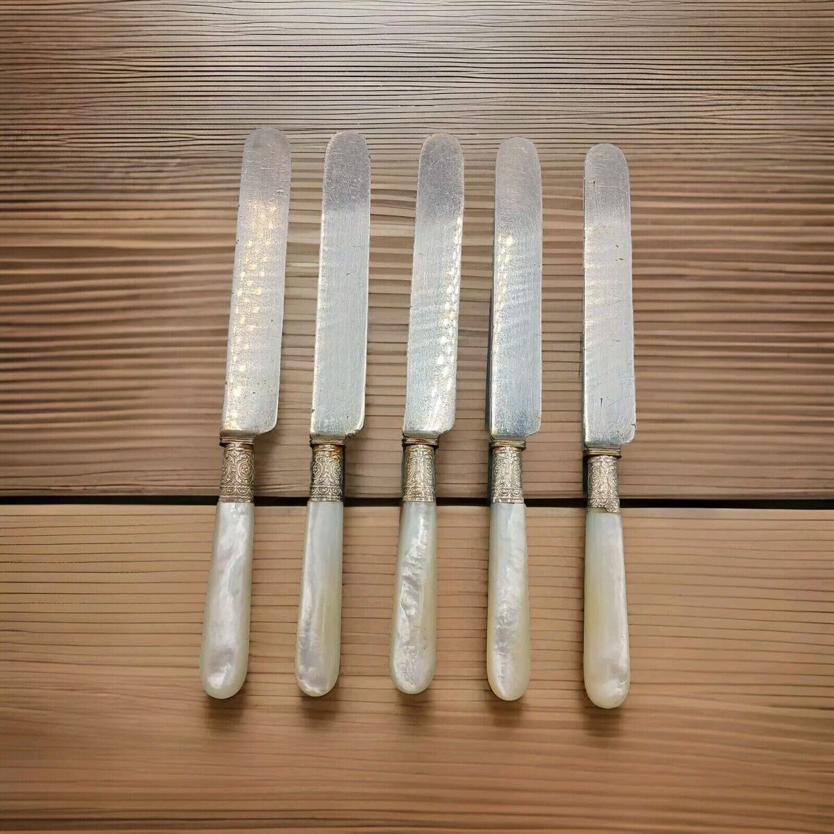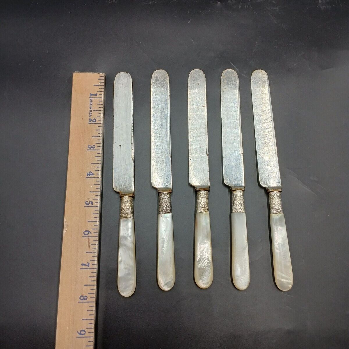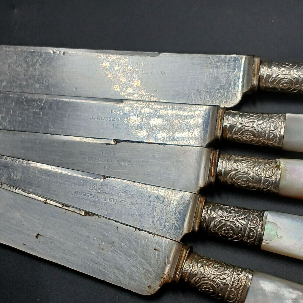- 1834 J Russell & Co Knife 5pcs Silverplate Ferrule Blunt End MOP Antique Pearl