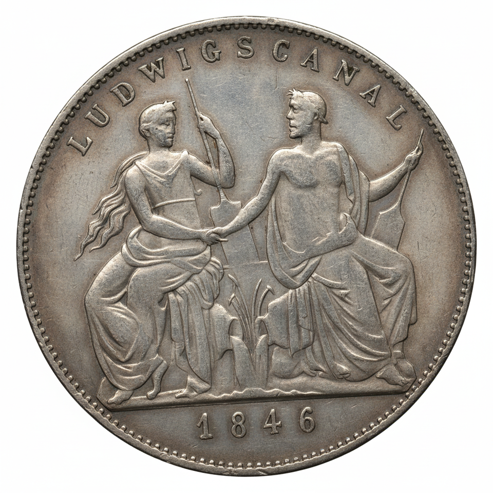 Entdecken Sie diese prachtige Ludwig-I. Bayern-Kanal-Gedenkmedaille von 1846, ein hervorragendes historisches Artefakt, das einen entscheidenden Moment in der deutschen Infrastruktur feiert. Dieses exquisite Stück zeigt das technische Wunderwerk des Ludwigskanals, der unter der Herrschaft von Konig Ludwig I. von Bayern Main und Donau verband, eine bedeutende Leistung, die 1846 vollendet wurde. Die Vorderseite zeigt eine allegorische Szene, die die Fertigstellung des Kanals darstellt, wobei das Jahr 1846 prominent dargestellt ist. Die Rückseite zeigt ein detailliertes Profil Ludwigs I., "KONIG VON BAYERN", was sie zu einer überzeugenden Kunstmedaille macht. Diese markante Nachpragung ist ein außergewohnliches numismatisches Sammlerstück, perfekt für Liebhaber deutscher Geschichte und europaischer industrieller Entwicklung. Seine proof-like Oberflache macht es zu einem atemberaubenden Ausstellungsstück. Als wertvolles Sammlerstück und historische Wertmarke bietet diese Gedenkmedaille eine spürbare Verbindung zum Bayern des 19. Jahrhunderts. Eine einzigartige Anschaffung für jeden ernsthaften Sammler, der ein antikes oder Vintage-Stück sucht.