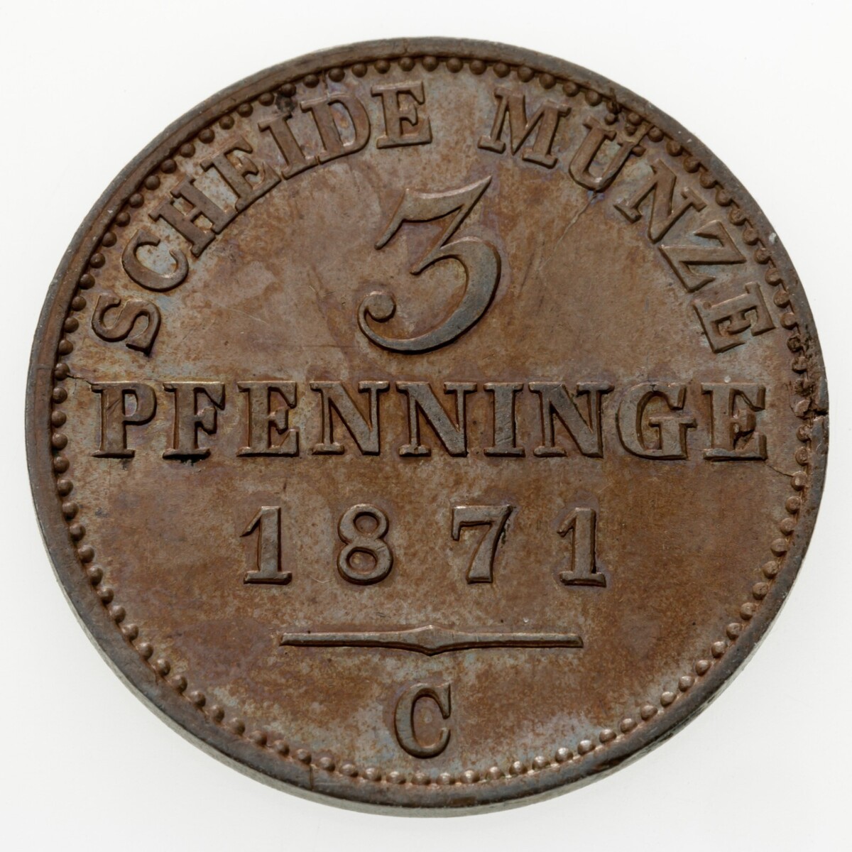 - 1871C German States Prussia 3 Pfennig Coin in BU, KM 482