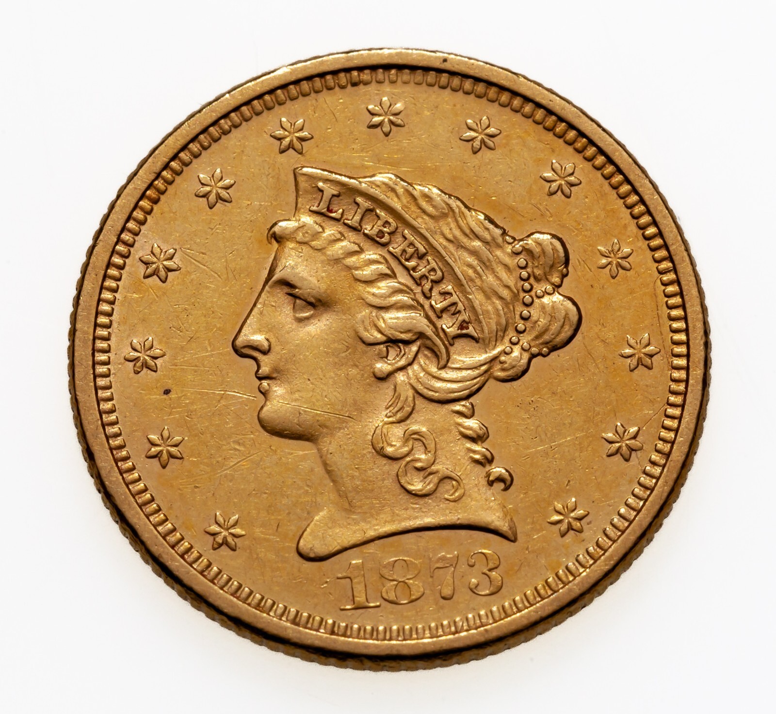 - 1873 Open 3 G$2.50 Gold Liberty Quarter Eagle in Unc Condition