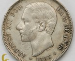 - 1883 (83) MS-M Spain 5 Pesetas Silver Coin in XF, KM# 688