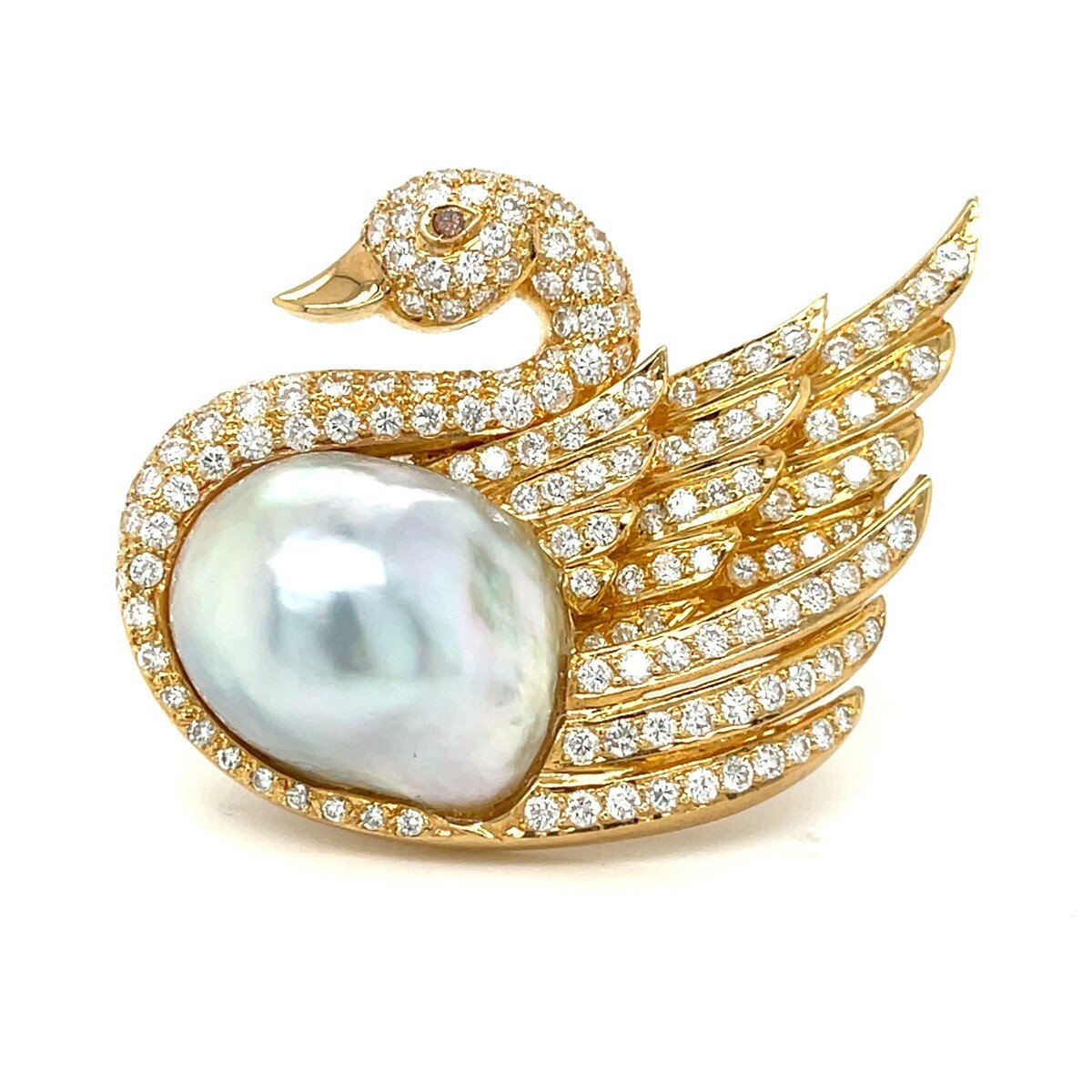 Stil/Design: Anmutige Schwan -Brosche mit 18 Karat Gelbgold, geschmückt mit 4 CT weißen Diamanten und einer prominenten Barockperle am Korper mit einem gelben Diamanten -Solitaire -Auge.