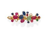 Cuenta con 16 esmeraldas, zafiros y rubíes tallados y 4 diamantes redondos.