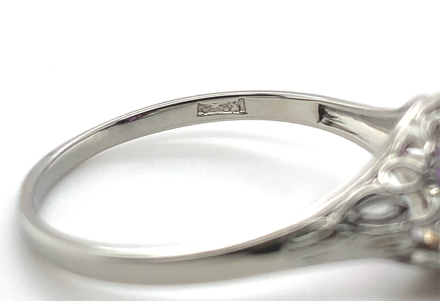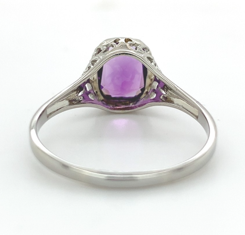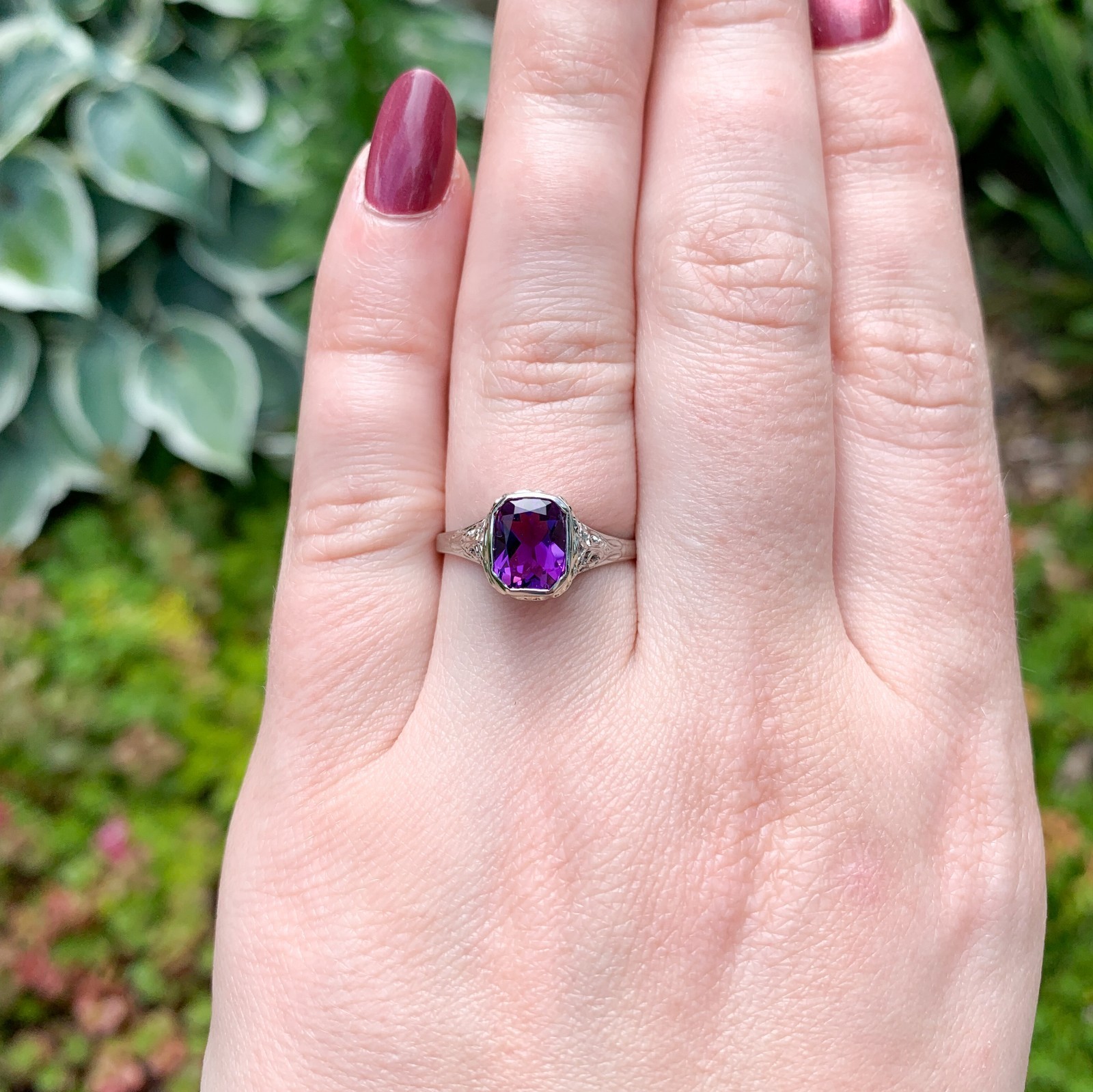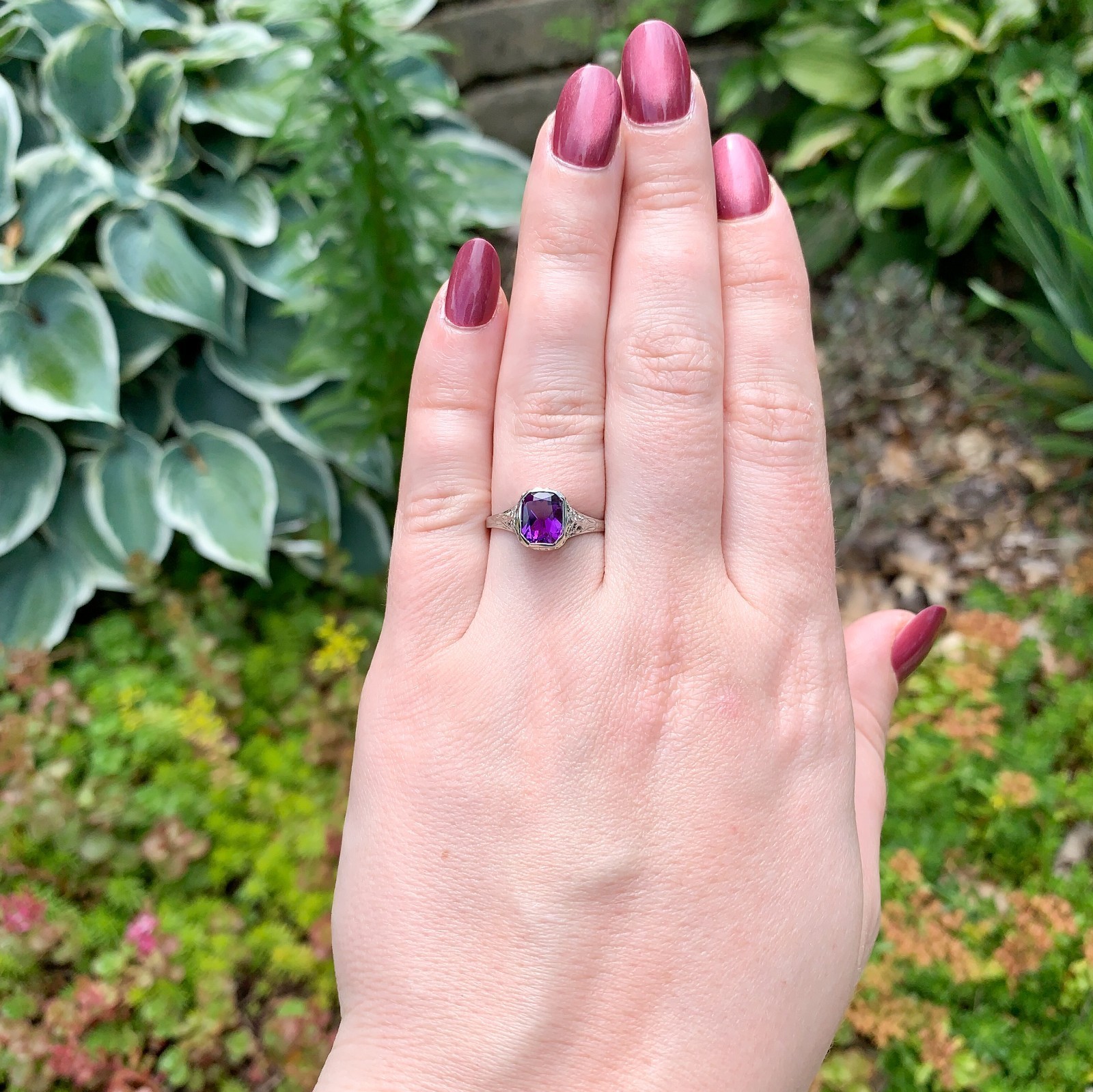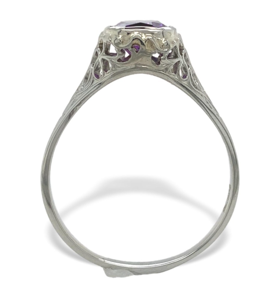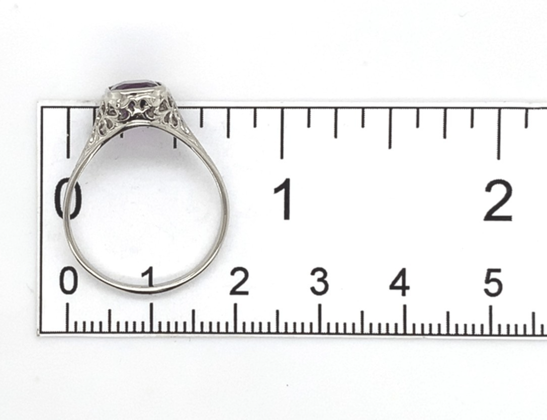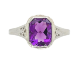 18k white gold amethyst filigree ring. The genuine earth mined amethyst is a radiant cut measuring about 8mm x 6mm and weighing 1.21 carats. The amethyst has medium dark purple color with fuchsia flash. The ring fits a size 7.5 finger and weighs 1.38 dwt. It dates from the 1920s. Terrific!
