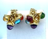 Style/Design: Gold earrings set with several dangling smooth, rounded, and polished gemstones in a variety of hues, including shades of purple, blue, green, amber, and red.