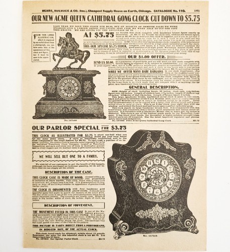 1900 Gong Mantle Clocks Advertisement Victorian Sears Roebuck 5.25 x 7"