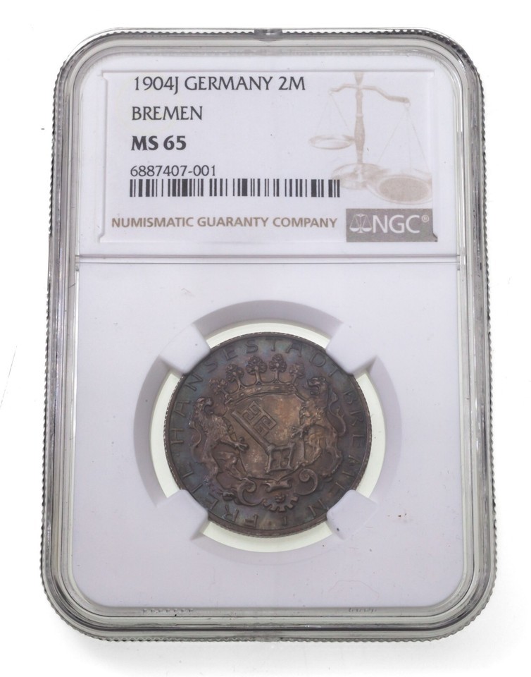 - 1904 German States Bremen 2 Mark Graded by NGC as MS-65