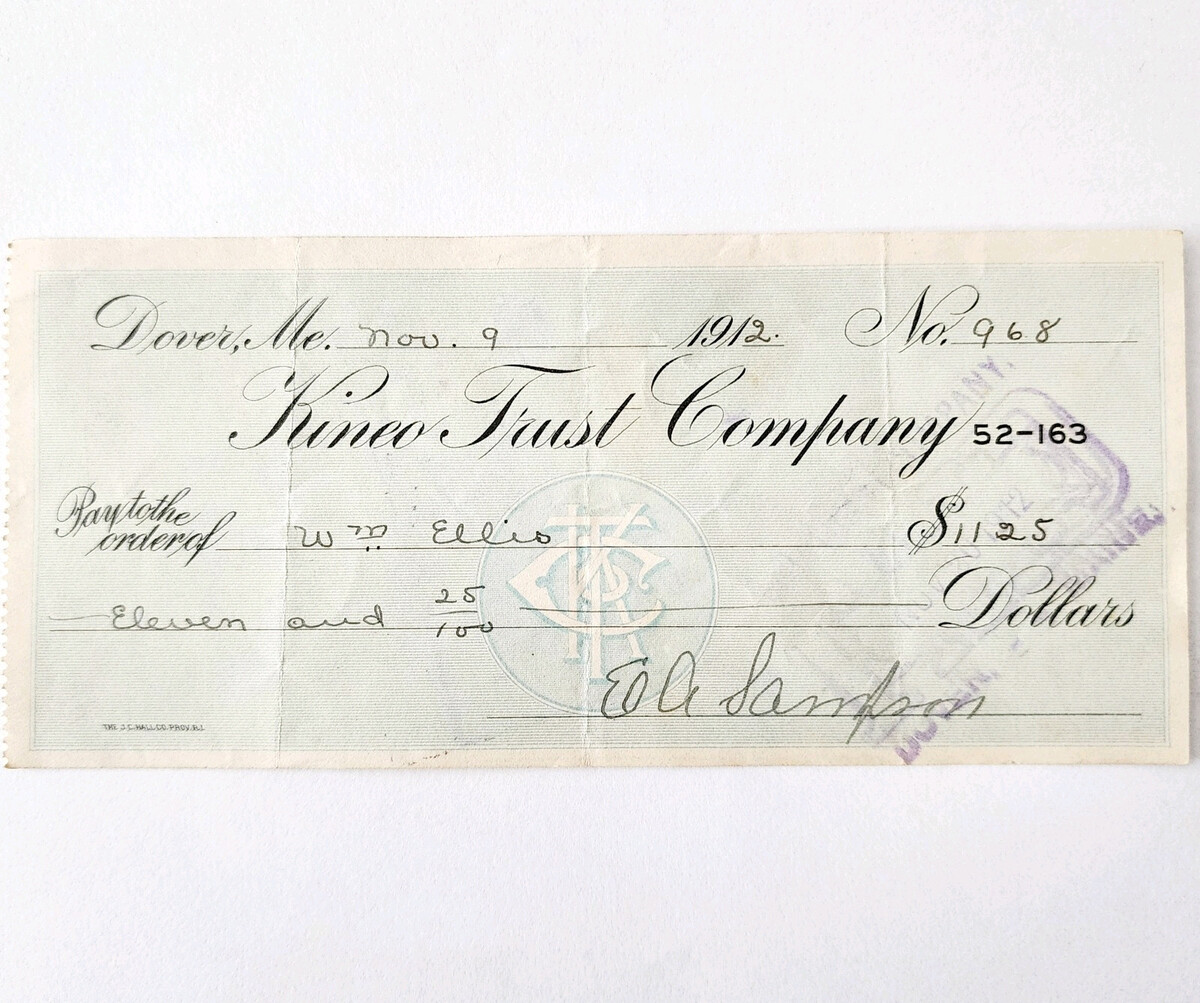 - 1912 Kineo Trust Company Bank Check E.A. Sampson Dover Maine Signed 968 CHX1