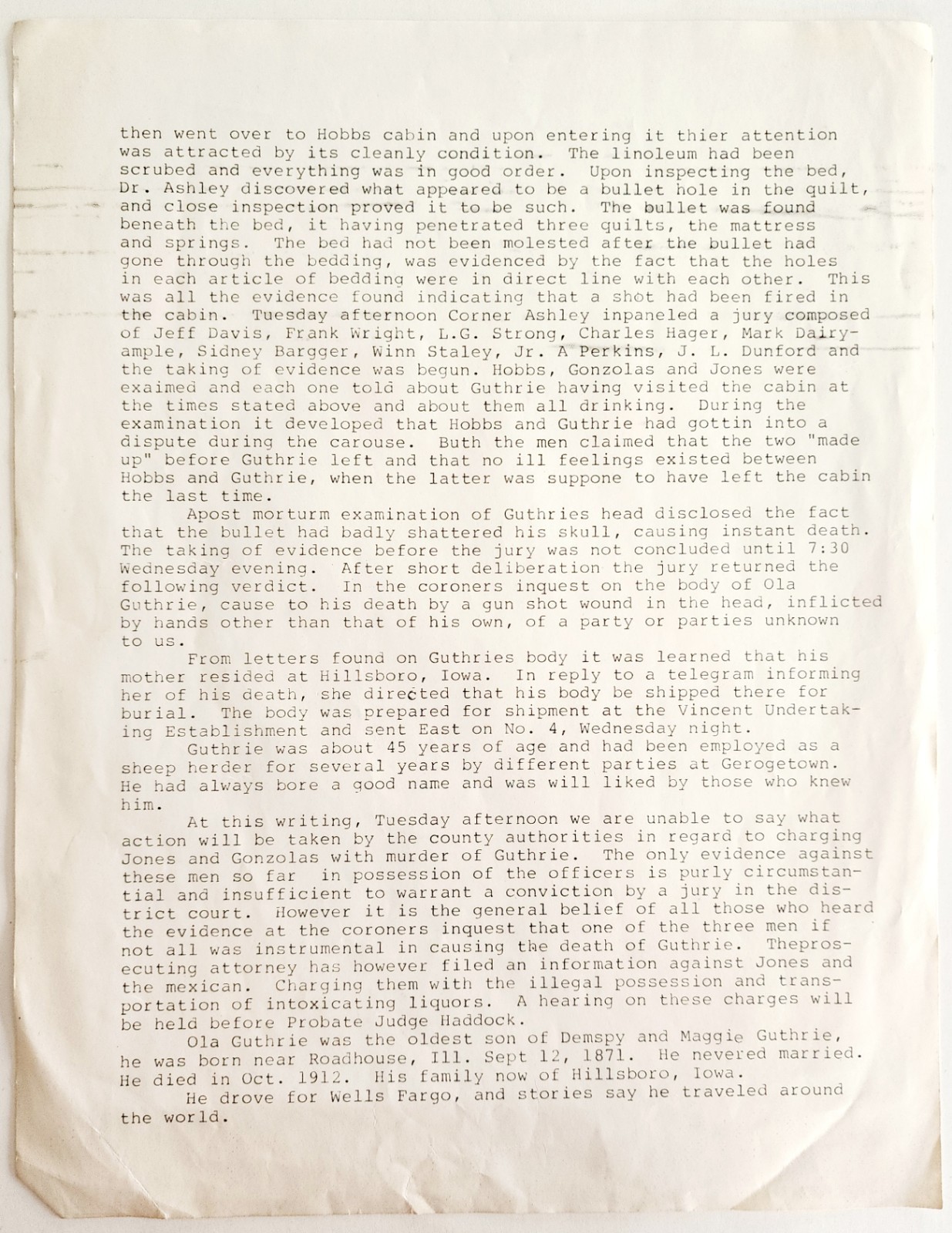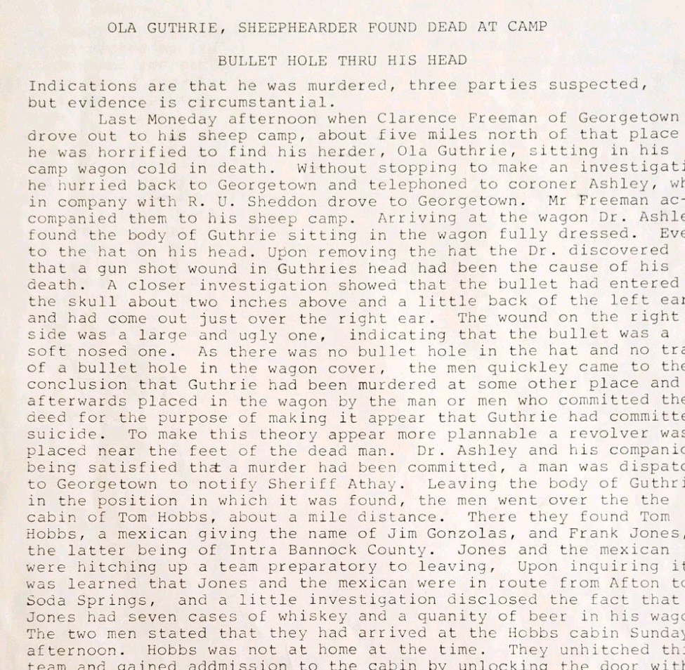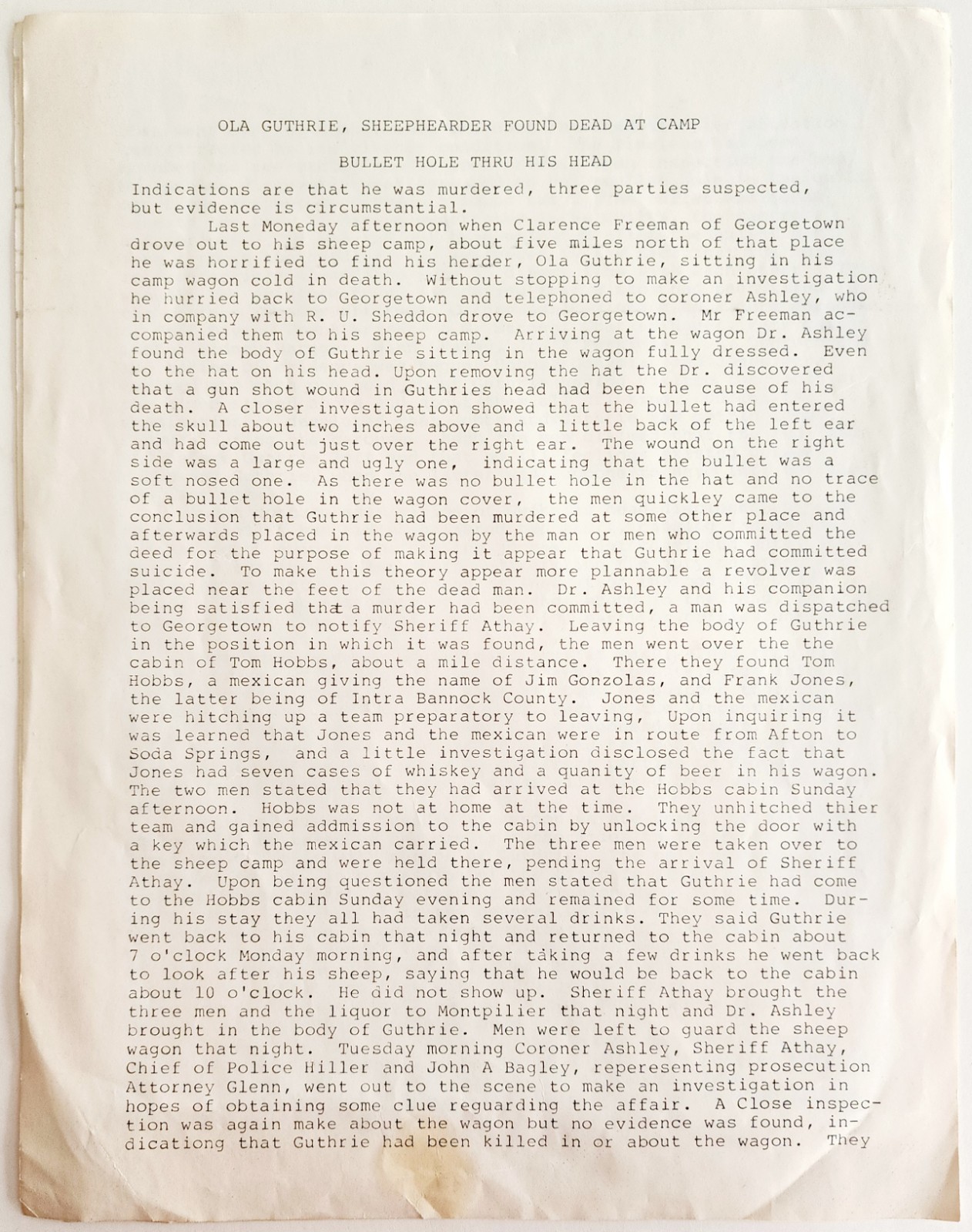 This appears to be the draft for a newspaper explaining the story of a murder in Georgetown, Idaho of sheepherder Ola Guthrie.