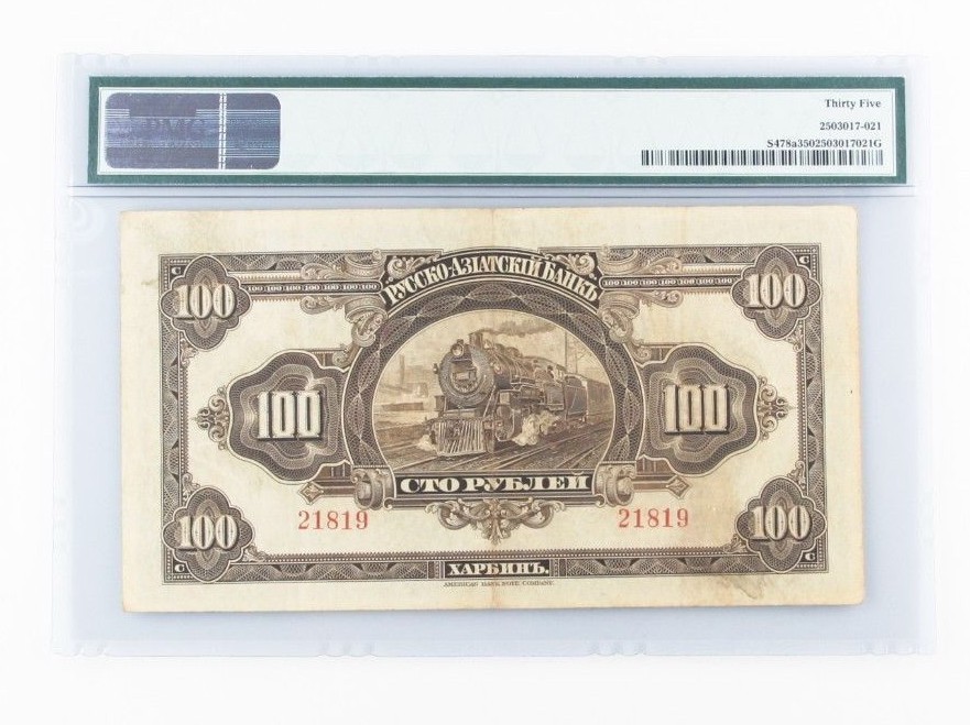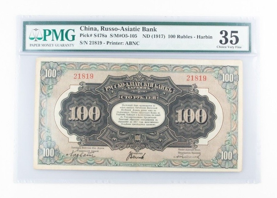 Scelle dans un support PMG avec le titre "Chine, Russo-asiatic Bank // Pick # S478A S / M # 05-105 ND (1917) 100 Roubles - Harbin // S / N 21819 - Imprimante: ABNC"