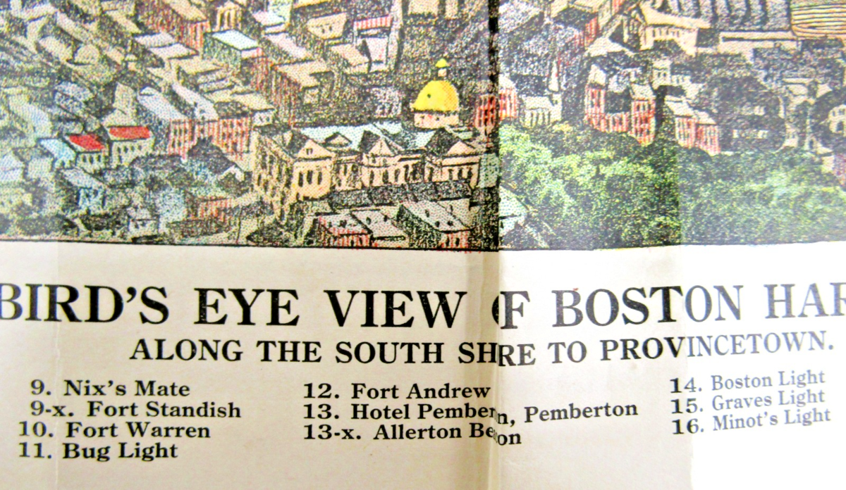 Nice bird's-eye map produced for the tourist trade. The attractively colored map folds into paper covers with title "Bird's Eye View of Boston Harbor in colors Along the South Shore to Plymouth Cape Cod Canal and Provincetown Showing all Steamboat Routes. Price 10 cents." The map extends from South Bay all the way to Cape Cod Bay and Provincetown. At the bottom is a numerical key naming and locating 25 landmarks and lighthouses. The map names East Boston, Dorchester Bay, Quincy Bay, Governor's Island, Peddock's Island, Deer Island, Nantasket Beach, Duxbury, Jerusalem, and much more. Numerous ferry and ship routes are shown. The map was printed by either the collotype or color gravure method by the Federal Engraving Co., Boston. Published by The Union News Company.