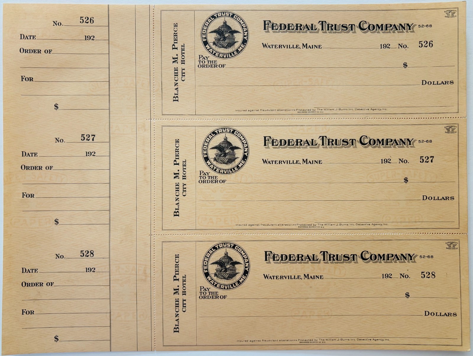 1920 Federal Trust Checks Lot of 3 City Hotel Waterville Maine 526-528 F18C2