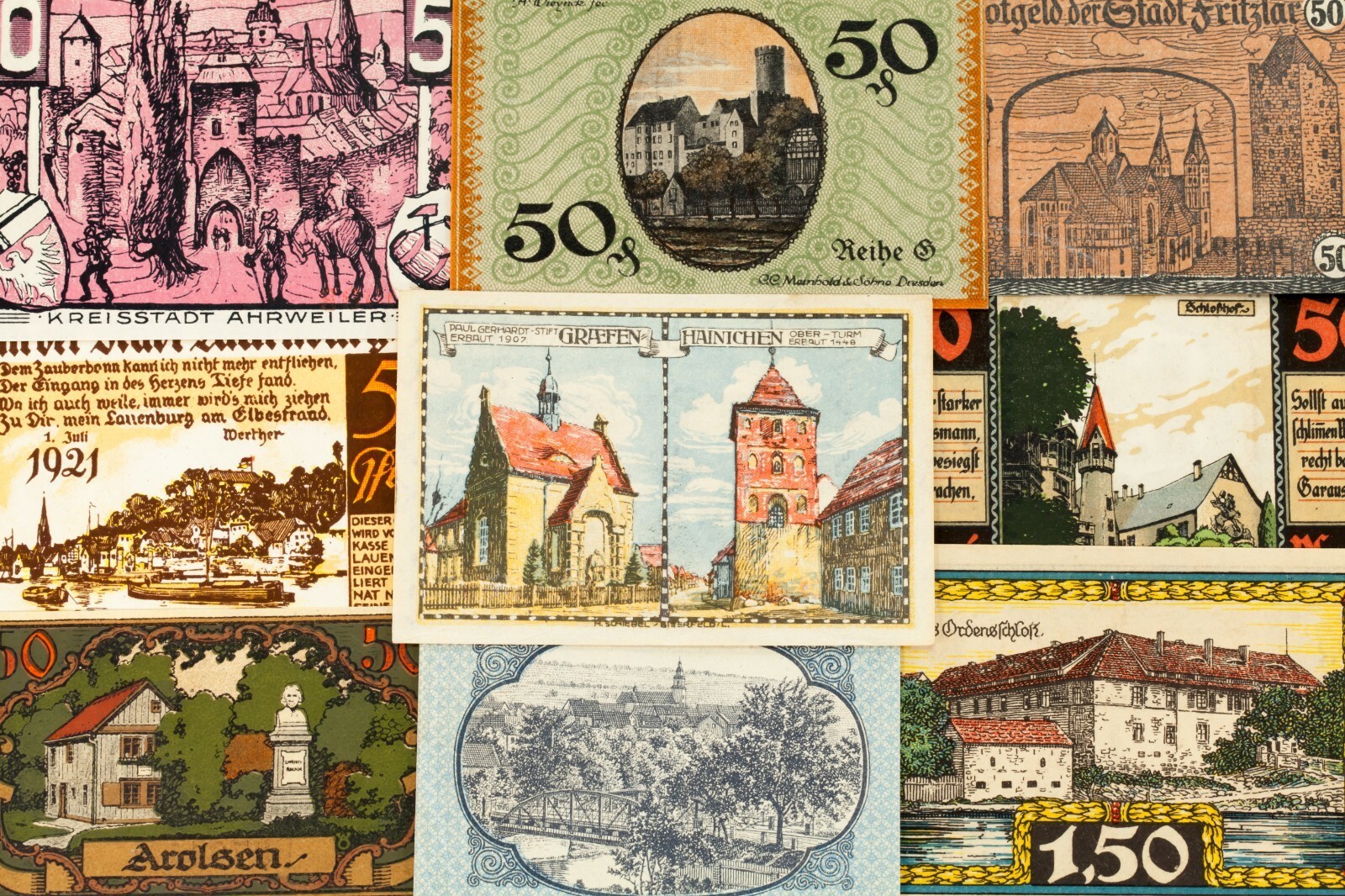 Ce lot comprendra 25 notes de notgeld individuelles d'Allemagne apres la Premiere Guerre mondiale. Valeurs faciales entre 5 pfennig a 5 marque. Theme des vues de la ville; Couvrages, batiments et paysages celebres.