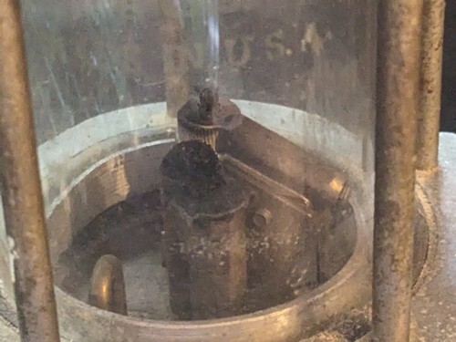 A vendre est une lanterne de lampe de securite Wolf des annees 1920 d'occasion pour les grottes, fabriquee aux Etats-Unis pour le ministere de l'Interieur du Bureau des Mines.