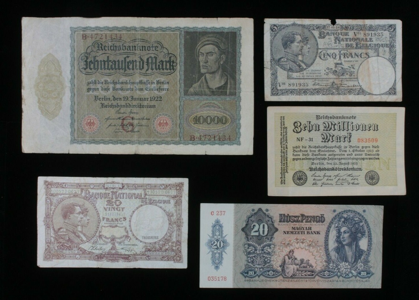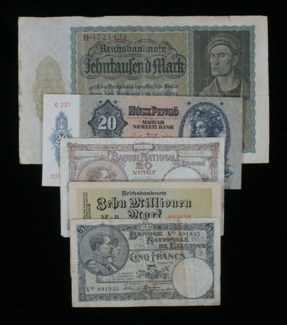 - 1922-1943 European 5-Note Currency Kit Belgium, Germany & Hungary- show origi...