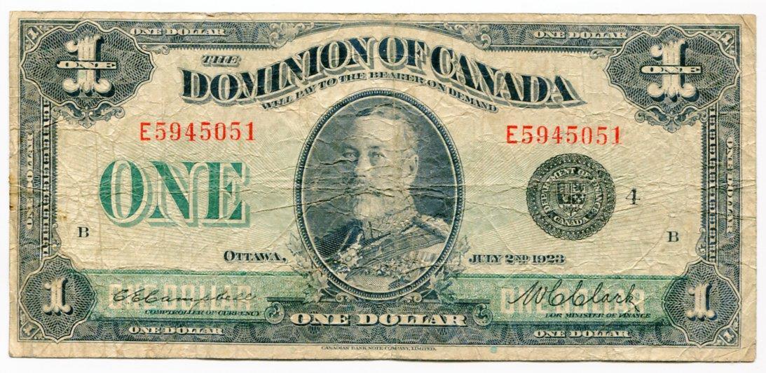 - 1923 Dominion of Canada $1.00 One Dollar Note E5945051 King George V
