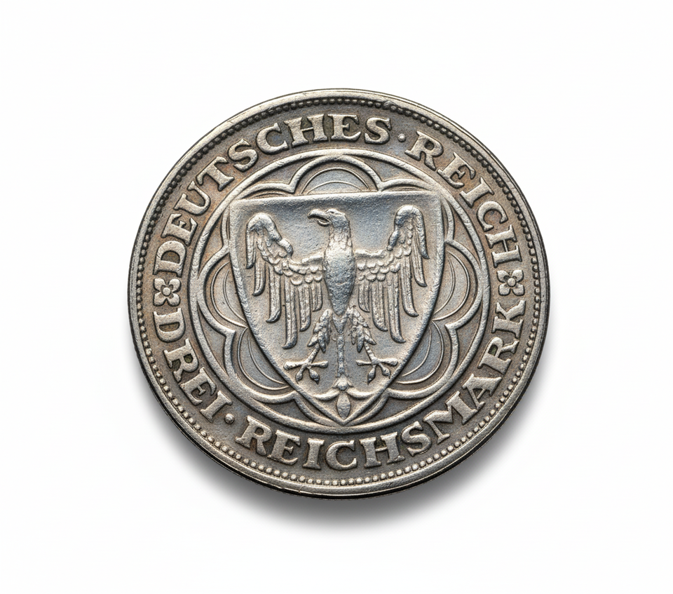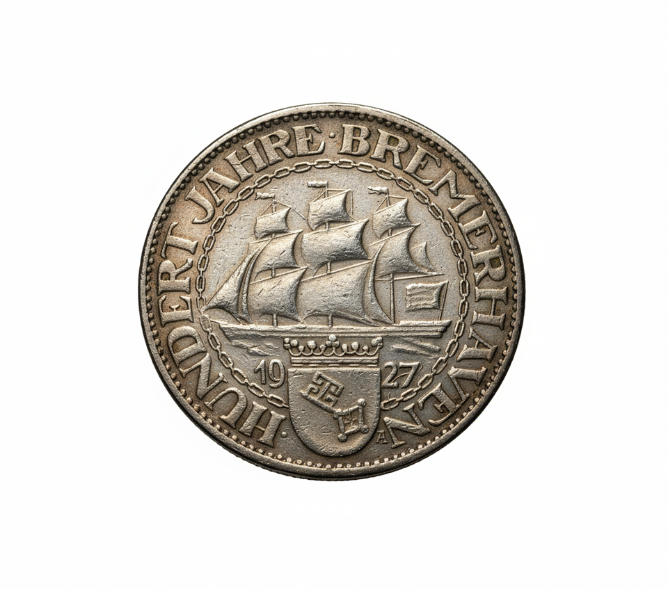 Discover this exquisite 1927 German Empire Bremerhaven Centenary commemorative fantasy medal restrike. This beautifully detailed piece, inspired by the historical Drei Reichsmark design, celebrates 'Hundert Jahre Bremerhaven' (One Hundred Years of Bremerhaven). The obverse depicts a majestic sailing ship above the city's crest, while the reverse features the iconic German eagle emblem of the Deutsches Reich, surrounded by 'DEUTSCHES REICH' and 'DREI REICHSMARK'. This meticulously crafted restrike is an exceptional collectible, appealing to numismatic enthusiasts and history buffs alike. It serves as a tangible historical token, a proof-like art piece that evokes the era of the Weimar Republic. Its design reflects significant historical events, making it a highly desirable collector's item. Perfect for any collection, this commemorative medal is a must-have for those interested in German history and unique numismatic pieces. A truly captivating restrike that adds historical depth to any display.