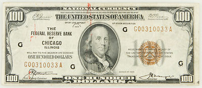 ONE-HUNDRED DOLLAR BILL Note is in Extra Fine Condition. Some crinkling/folds along horizontal center and vertical thirds. Some red staining on front. No pinholes. See photos for details. CALIFORNIA BUYERS: 9 % SALES TAX WILL BE ADDED INSURANCE DELIVERY CONFIRMATION OR SIGNATURE CONFIRMATION Please call us with any Inquiries: Continental Coin and Jewelry Company Web Department: Monday thru Friday, from 10:30am-6pm (818-781-4232) Reference Item # USN-13606 on multiple purchases. would not be combined. We appreciate your understanding.