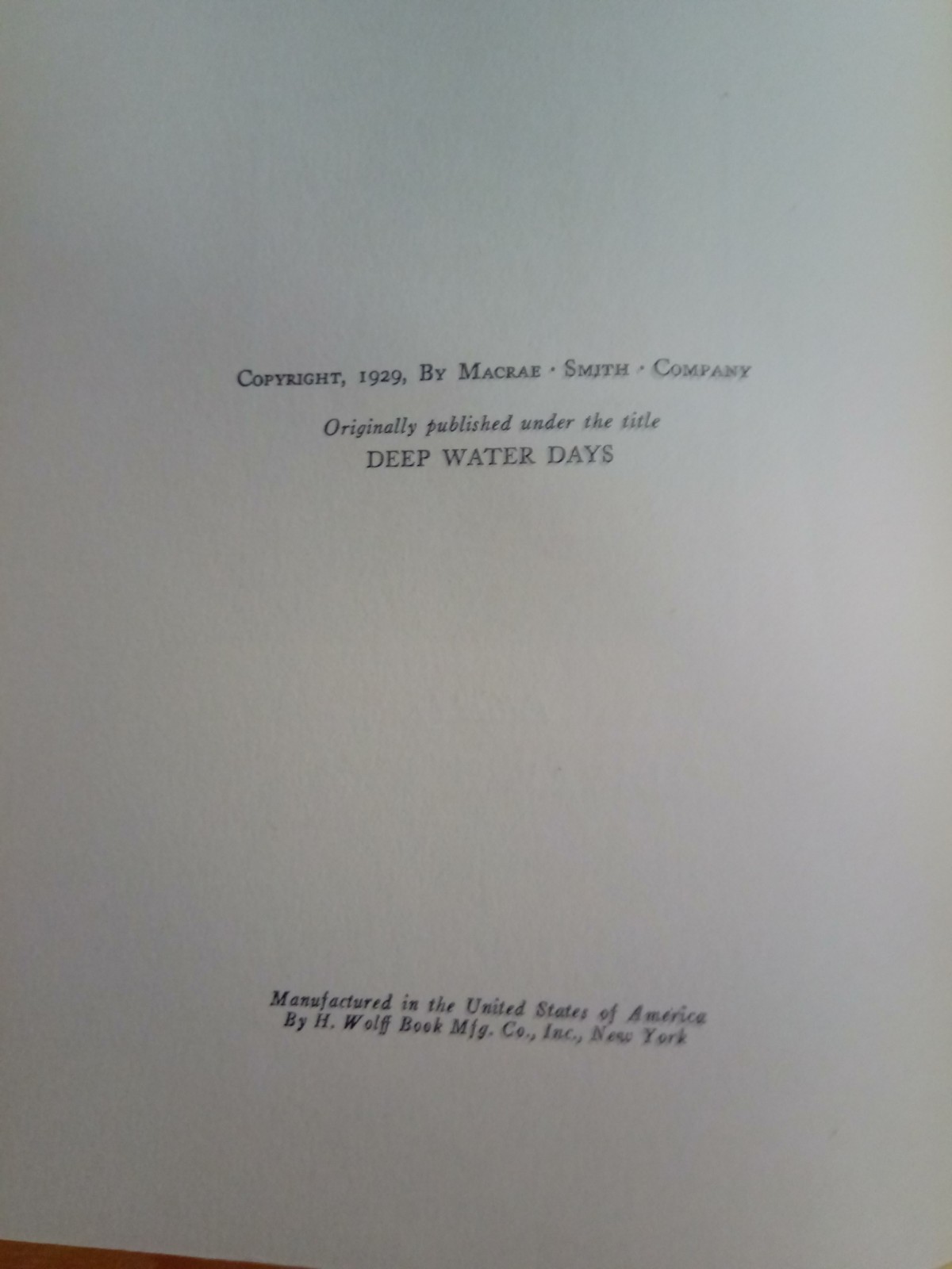 The book, originally titled "Deep Water Days," tells a fictional story about battles involving wooden ships. fair condition, pages and binding are good, cover has UV fading on spine and some corner turns.