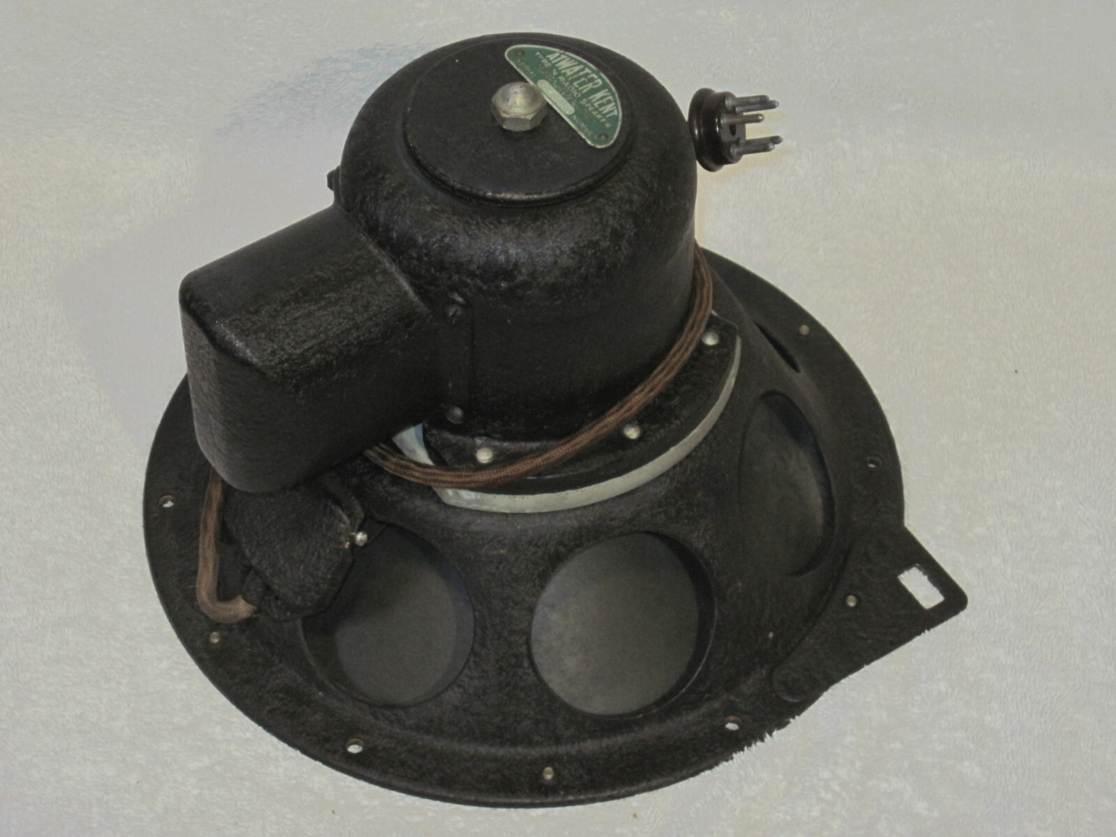 For sale is a vintage AK Type N radio loudspeaker in excellent physical shape ! Purchased at an estate sale on 06/21/25. Cone and surround have NO holes, tears, stains etc. Painted frame looks great too... some paint missing on the brackets. The cable's fabric insulated cable and the plug look great too. When gently pressing on the cone, it moves smoothly in and out with no scraping. I'm assuming this is a "Field Coil" speaker? The large piece on the side of the bell cover looks like a wax capacitor...see the pic with it unscrewed from the bell. There's a small strain relief cover plate where the cable comes out from the speaker.. the cover plate is missing 1 of its 3 tiny screws but the 2 remaining screws hols the light cover plate intact just finem(see pic).