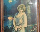 What a beautiful old F R Harper print from the 30's titled: Memories. It's a wonderfully expressive scene of a woman standing in front of a lover's tree with a gorgeous moon over the lake in the background. Since the title is "Memories", we can assume that it is this beautiful young lady having memories perhaps of the lover who's heart is linked to hers on the tree. The composition as a whole is quite exceptional and emotional in it's depiction of a wonderful era long lost in time.