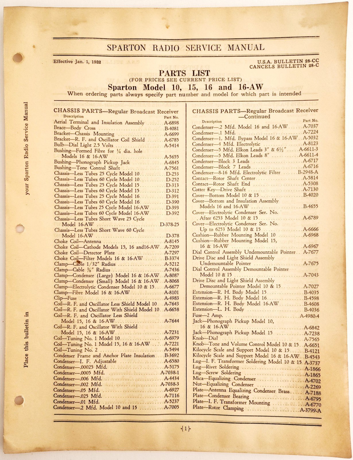 - 1931 Sparton Radio Model 10 15 16 16AW Parts List Electronics Ephemera F20A