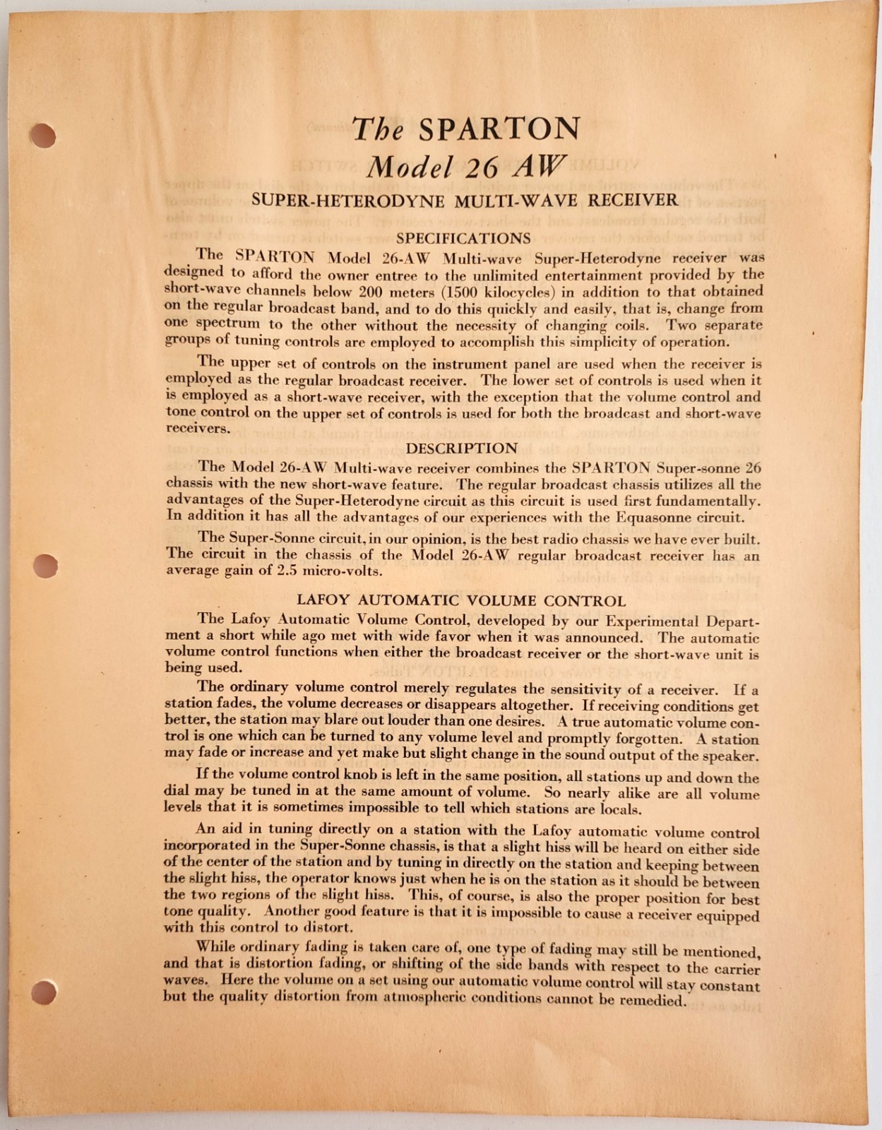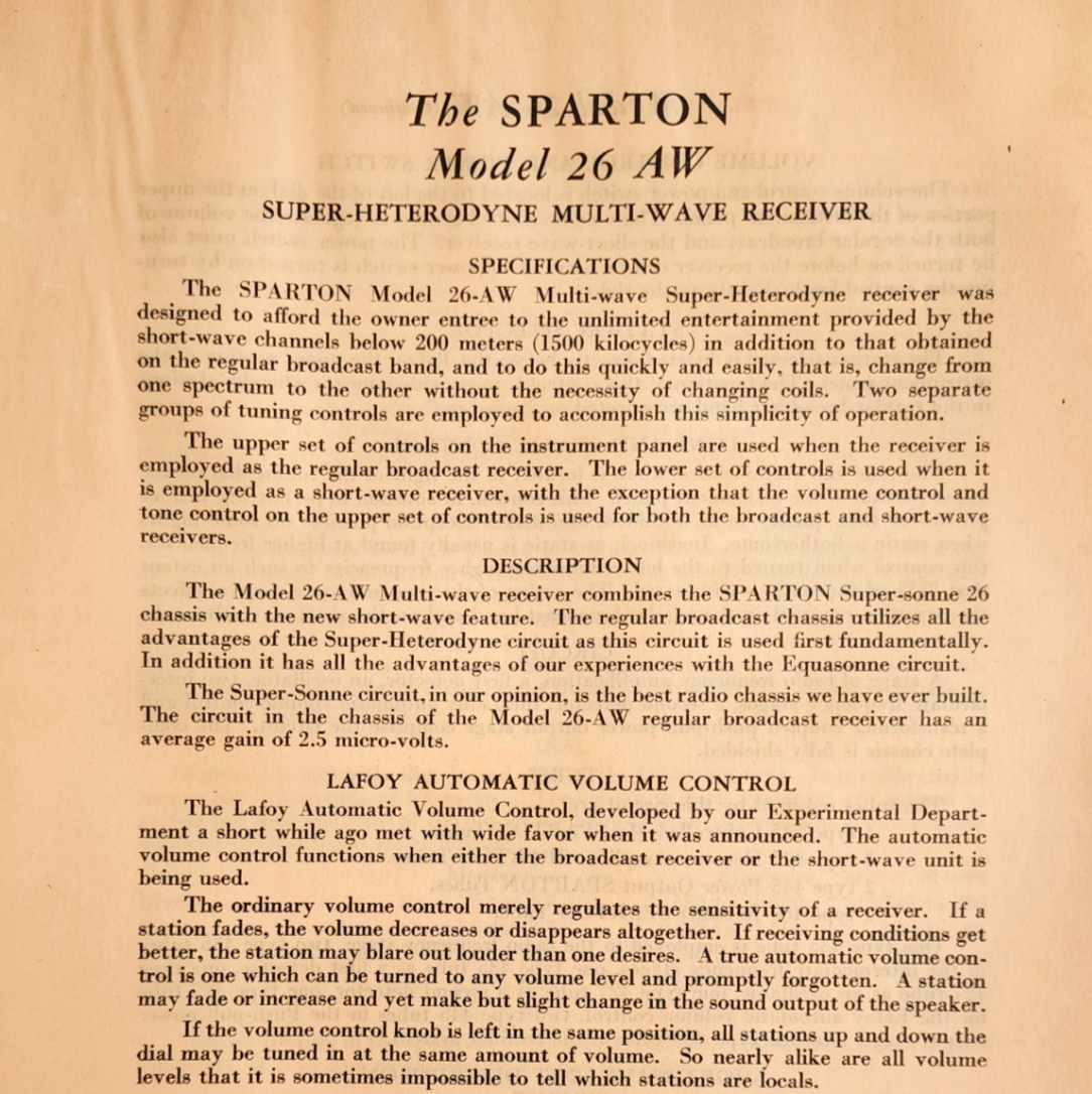 - 1931 Sparton Radio Model 26-AW Multi-Wave Info Advertisement Catalog 2 Pgs F20B