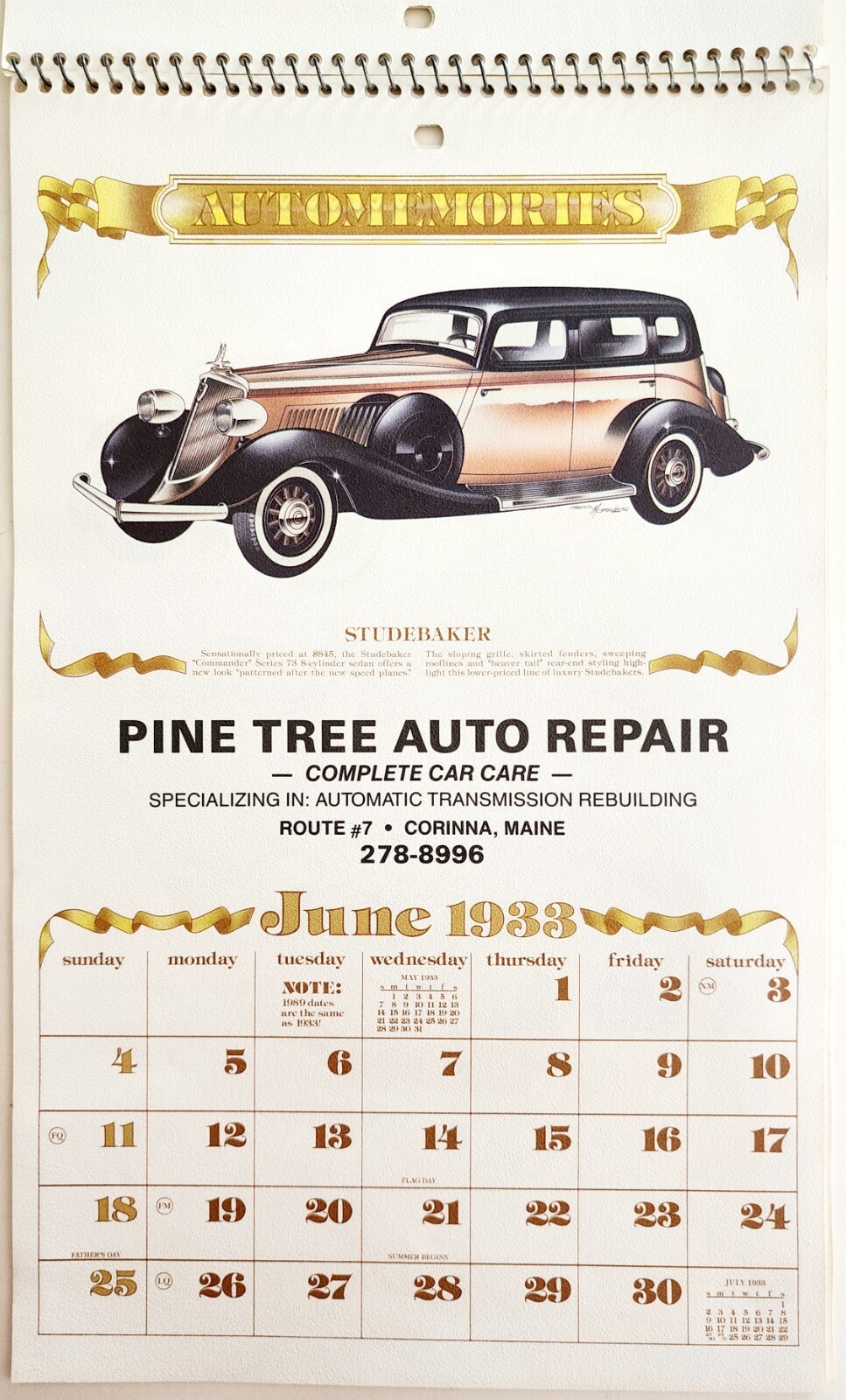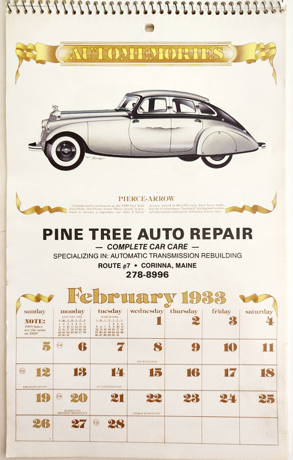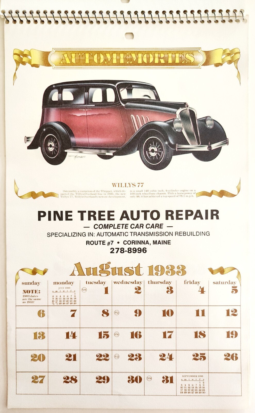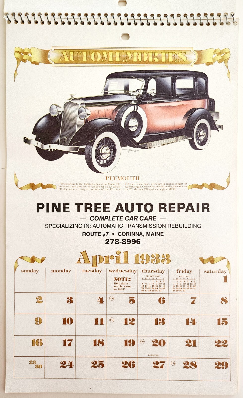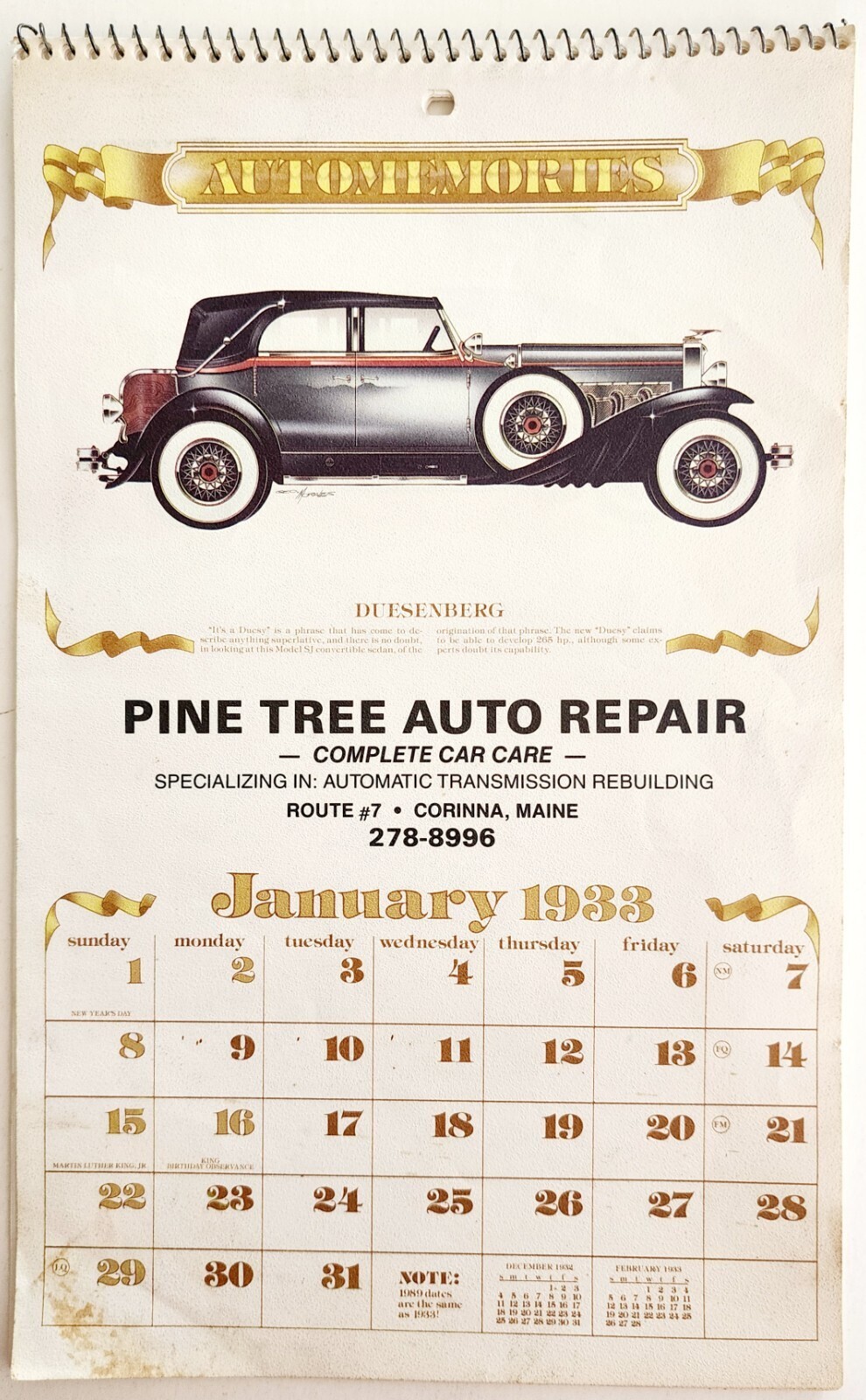 1933 Pine Tree Auto Repair Calendar Corinna Maine Classic Antique Cars Art DWWW1