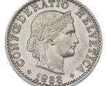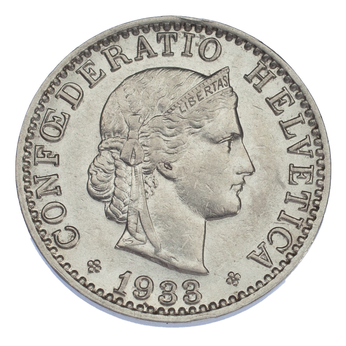- 1933 Switzerland 20 Rappen Coin (About Uncirculated, AU Condition) KM# 29