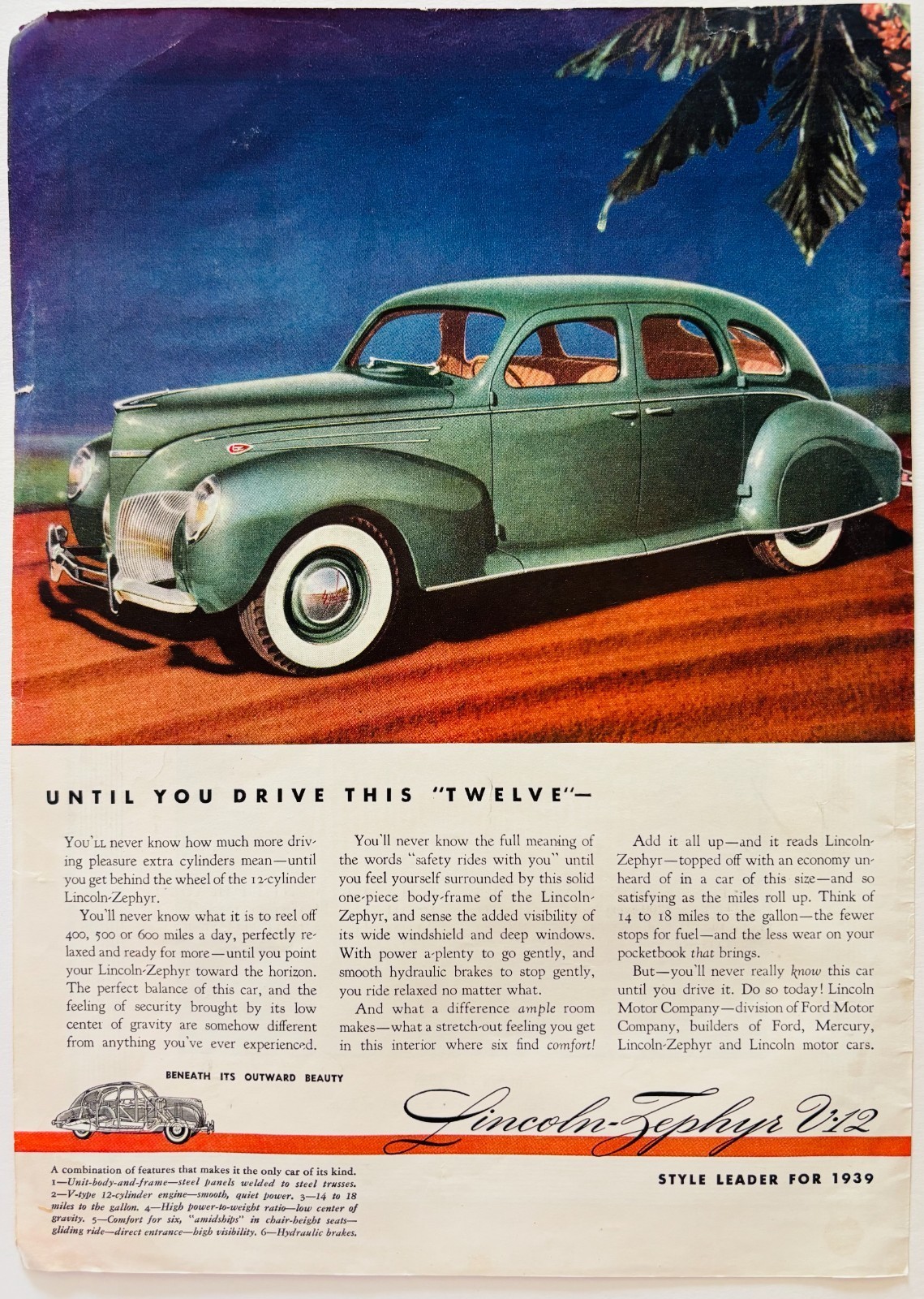- 1939 Lincoln Zephyr V12 Car Advertisement Automobilia Luxury Ford Motors E90E2