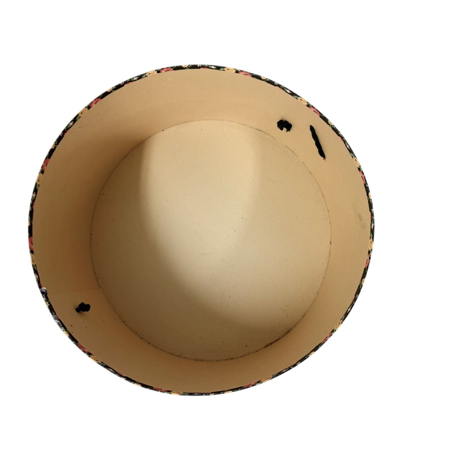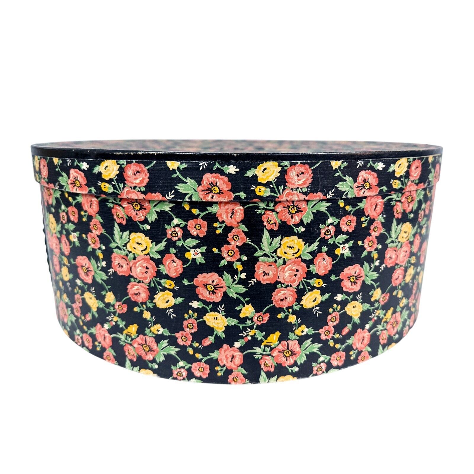 Transform your space with this stunning XL vintage wallpaper hat box featuring a beautiful pink, yellow and green floral design on a classic black background. Measuring 18" x 7", this exquisite piece is perfect for storing your wide-brimmed hats and adds a touch of retro elegance to any decor. Crafted to last, this box is both sturdy and delightful, making it the ideal choice for safeguarding your cherished wide-brim hats while enhancing the ambiance of your cozy vintage boudoir. With its excellent condition for its age, this hard-to-find size is a rare gem that you won't want to miss! Elevate your collection and style today!