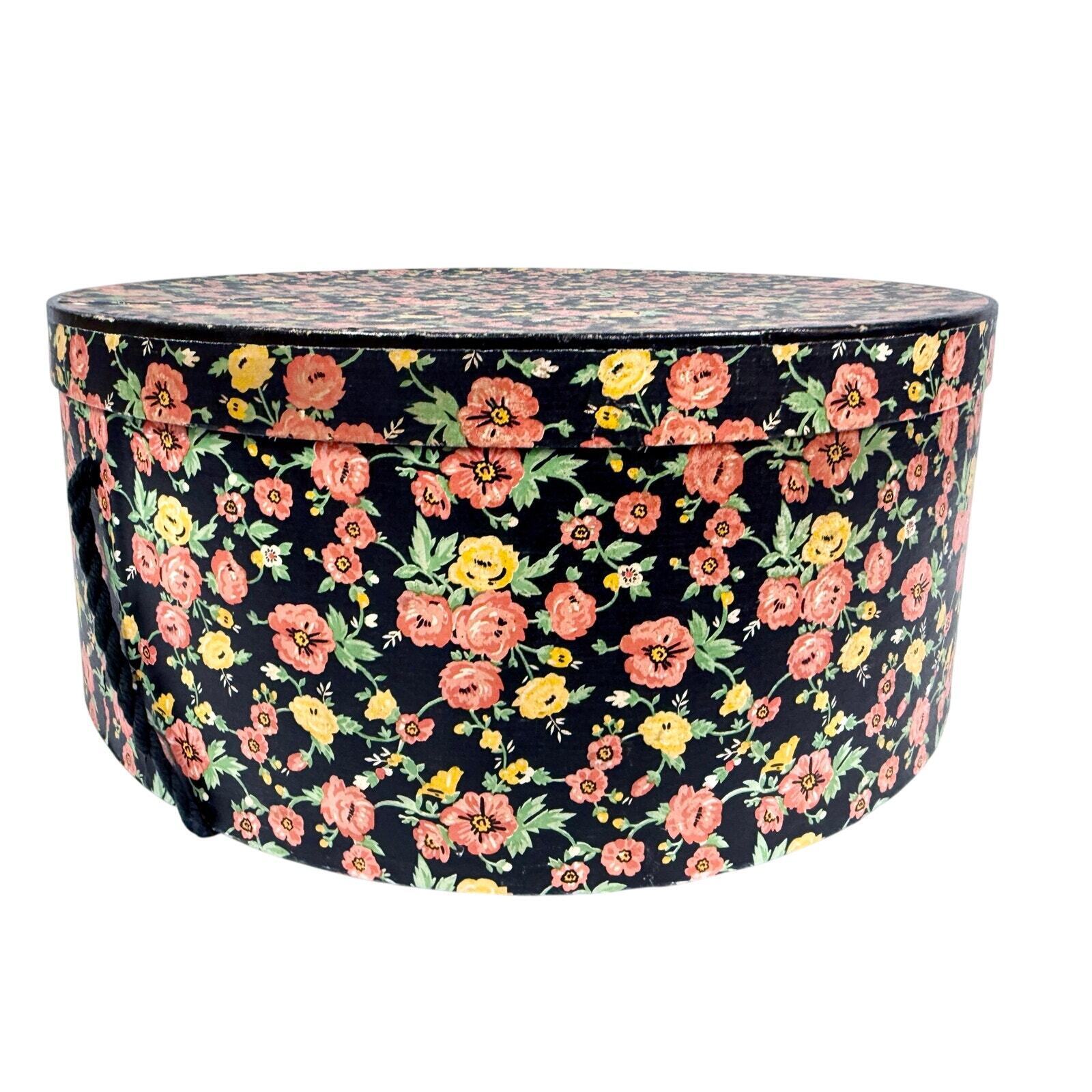 - 1940s-50s XL vintage wallpaper hat box Pink Flowers on Black 18" x 7" Wide Brim