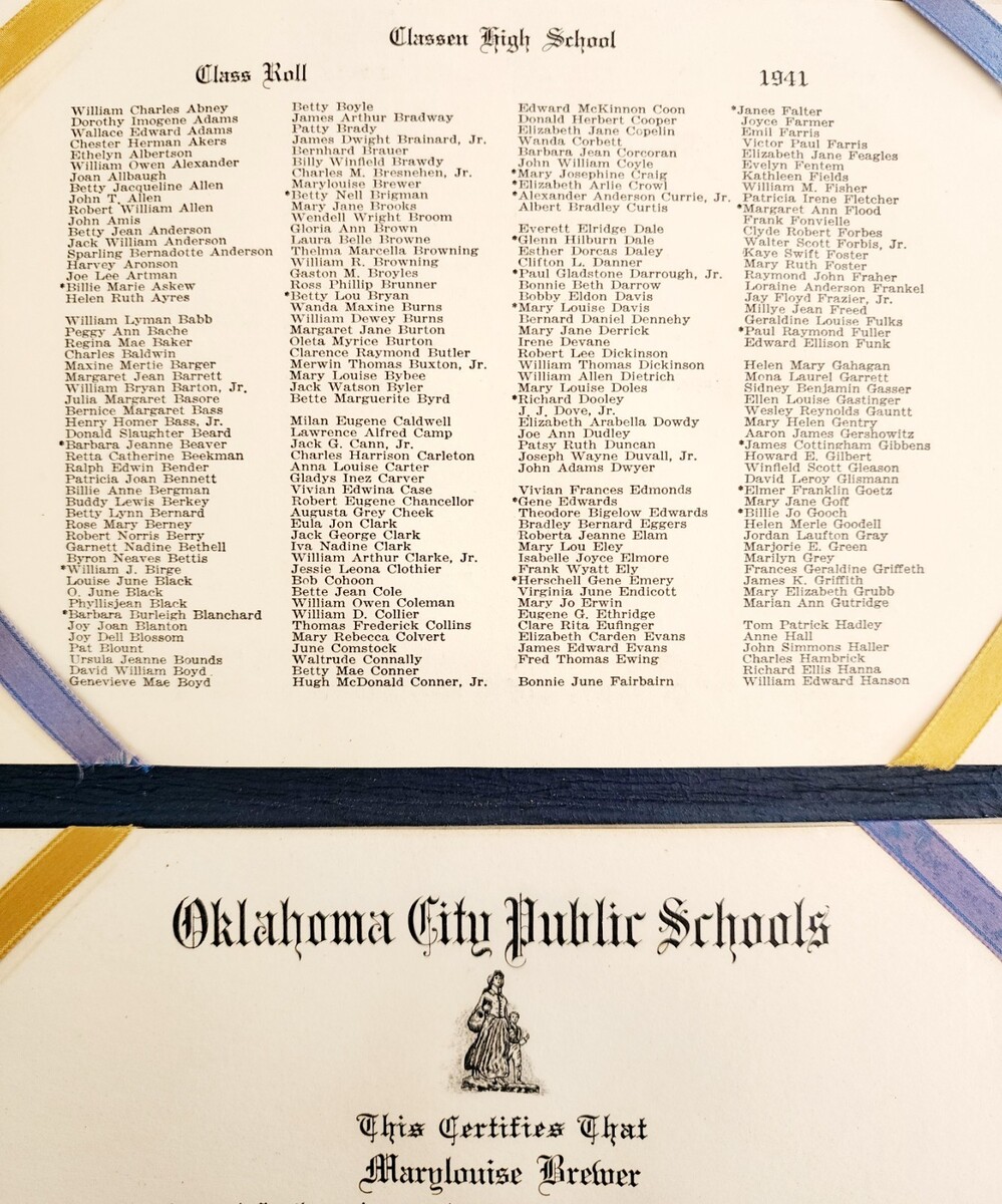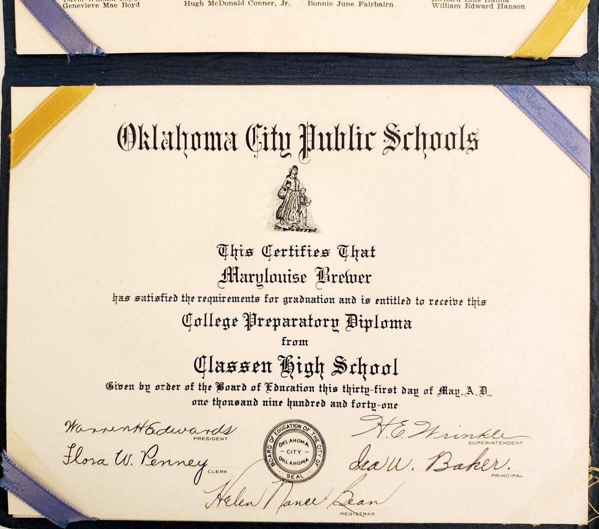 1941 Classen High School Oklahoma City Graduation Diploma Marylouise Brewer C99