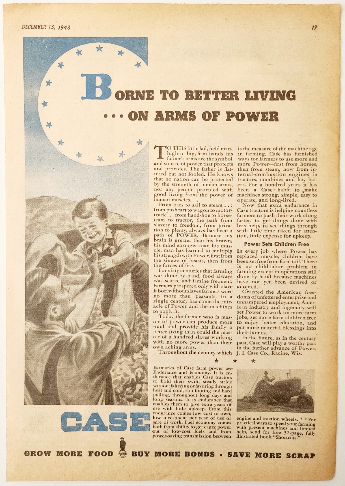 - 1943 Case Farm Power Advertisement WW2 Era Agriculture War Bonds DWP7A