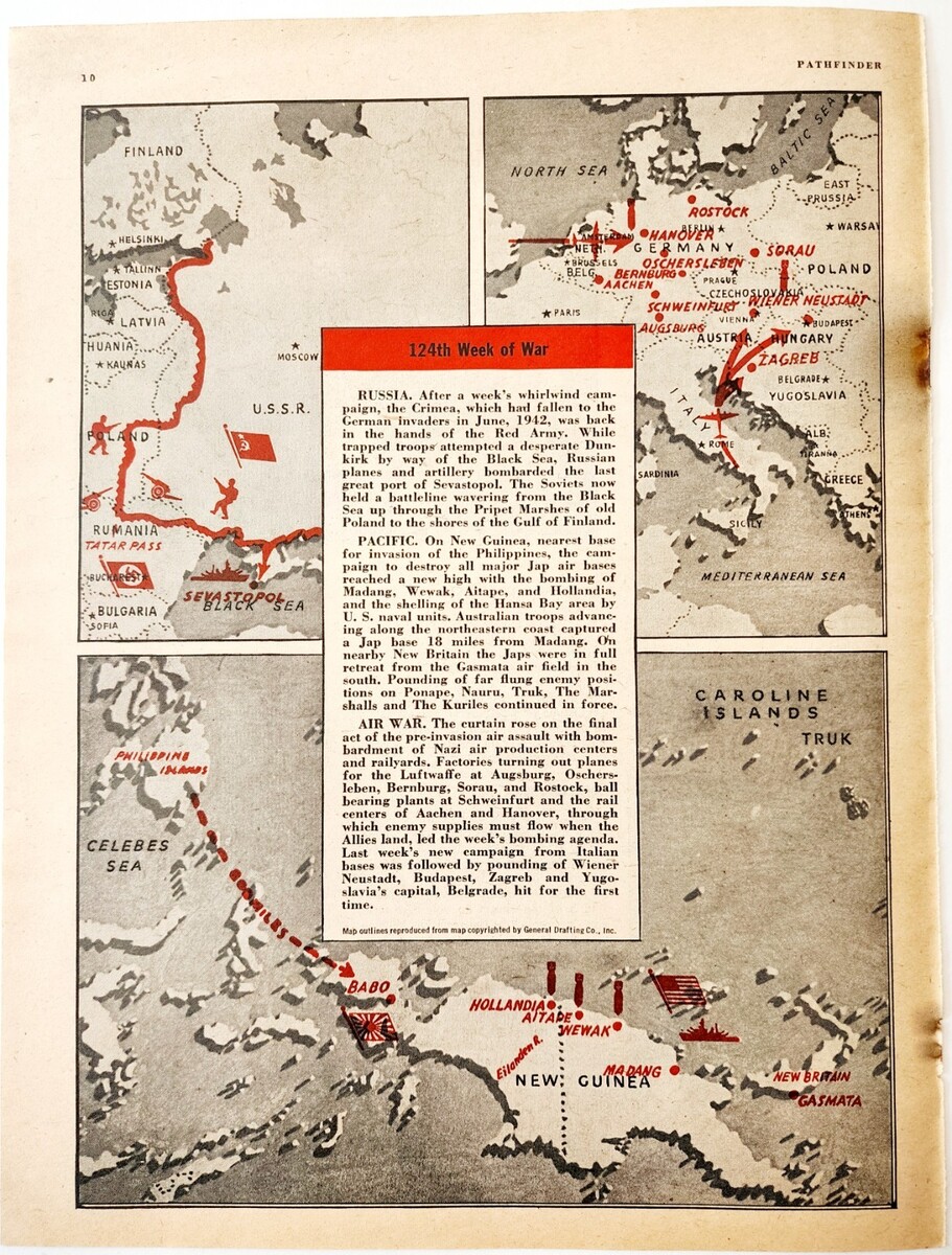 1944 WW2 124th Week Of The War Map Pathfinder Magazine Page Military DWP7B