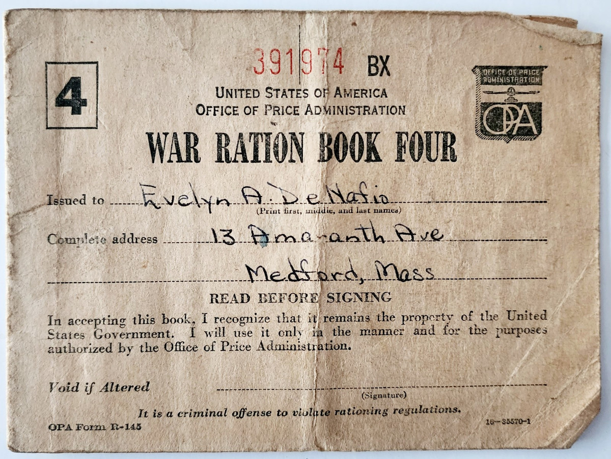 - 1945 WW2 War Ration Book 4 DeNafio Medford Massachusetts Military DWQQ13