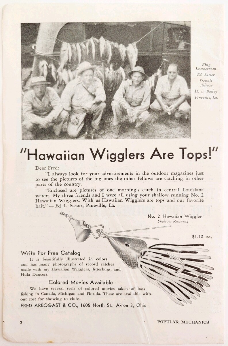 - 1947 Arbogast Hawaiian Wigglers Bait Advertisement Vintage Fishing Boating E8E