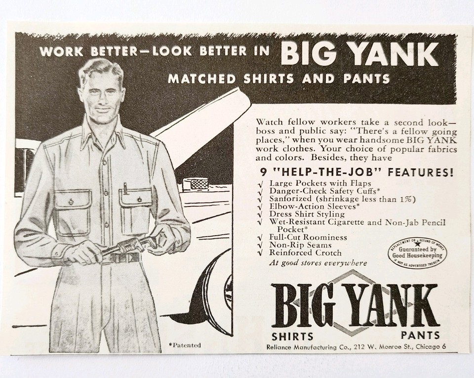 - 1947 Big Yank Work Clothes Advertisement Vintage Shirts Pants Clothing E8K