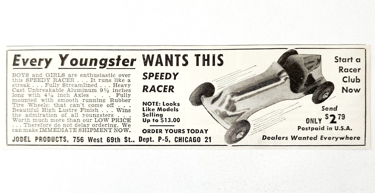 - 1947 Jodel Speedy Racer Model Toy Car Advertisement Vintage Derby Toys E8K