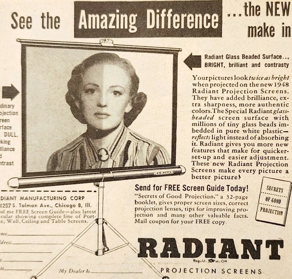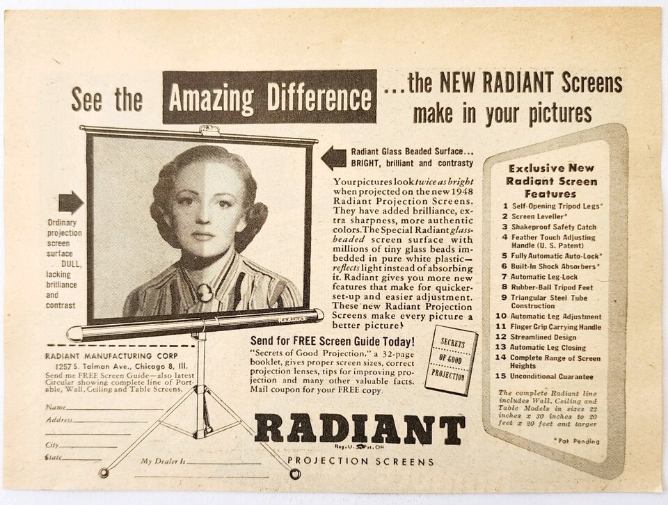 - 1947 Radiant Projection Movie Screen Advertisement Vintage Home Movies E8K
