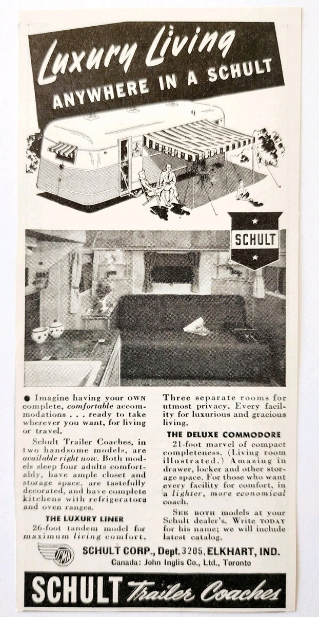 1947 Schult Trailer Coach Mobile Home Advertisement Vintage Automobilia E8K